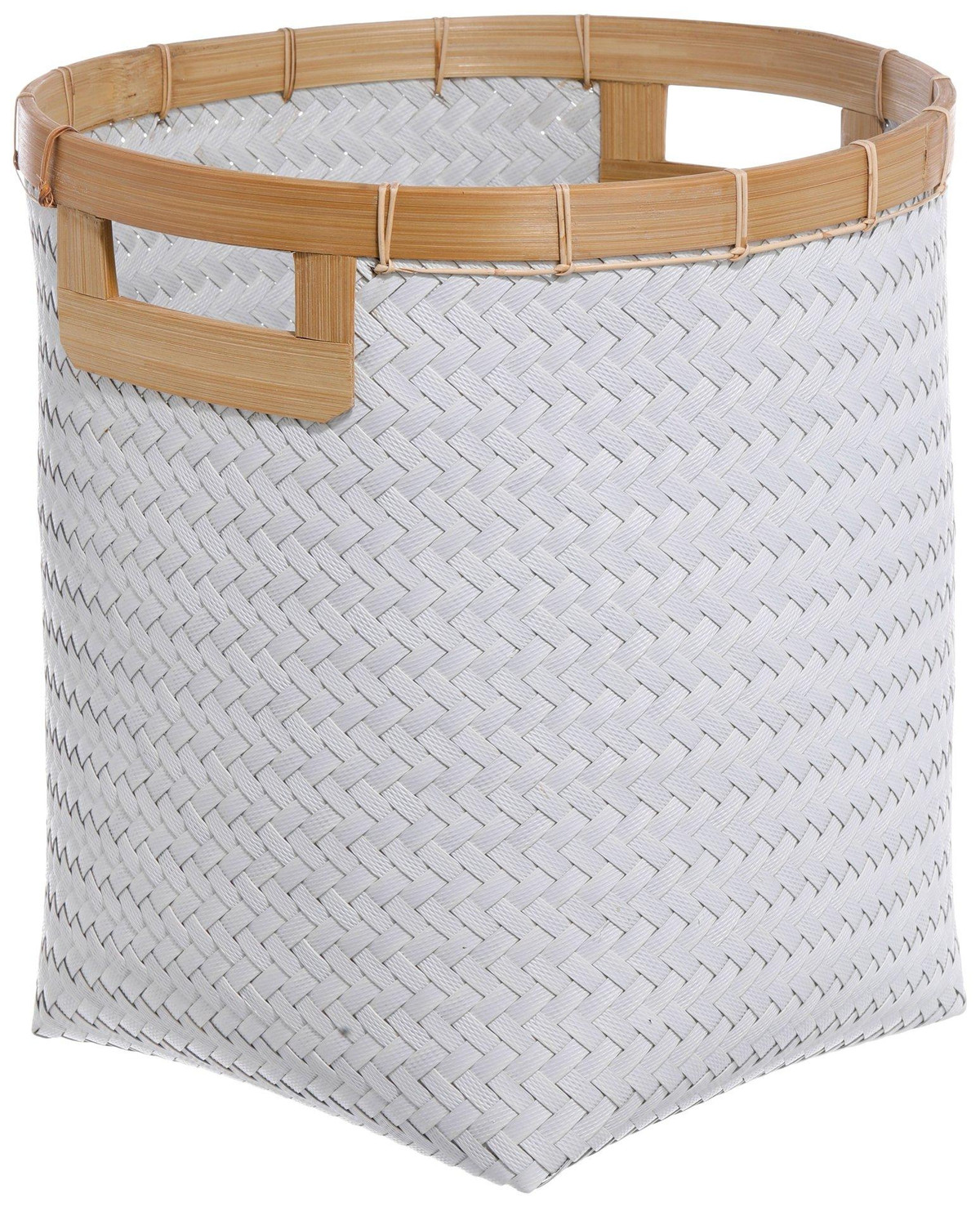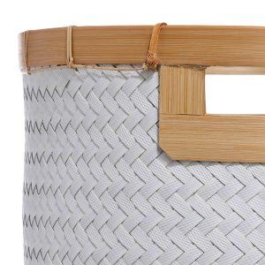 Natural simplicity meets refined craftsmanship in the Round Square Bottom Bamboo Storage Basketa unique fusion of organic texture and structured design. Handwoven from sustainable bamboo, its round top flows seamlessly into a square base, creating a striking shape that offers both visual appeal and sturdy functionality. Measures 14 in x 14 in x 15 in.