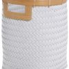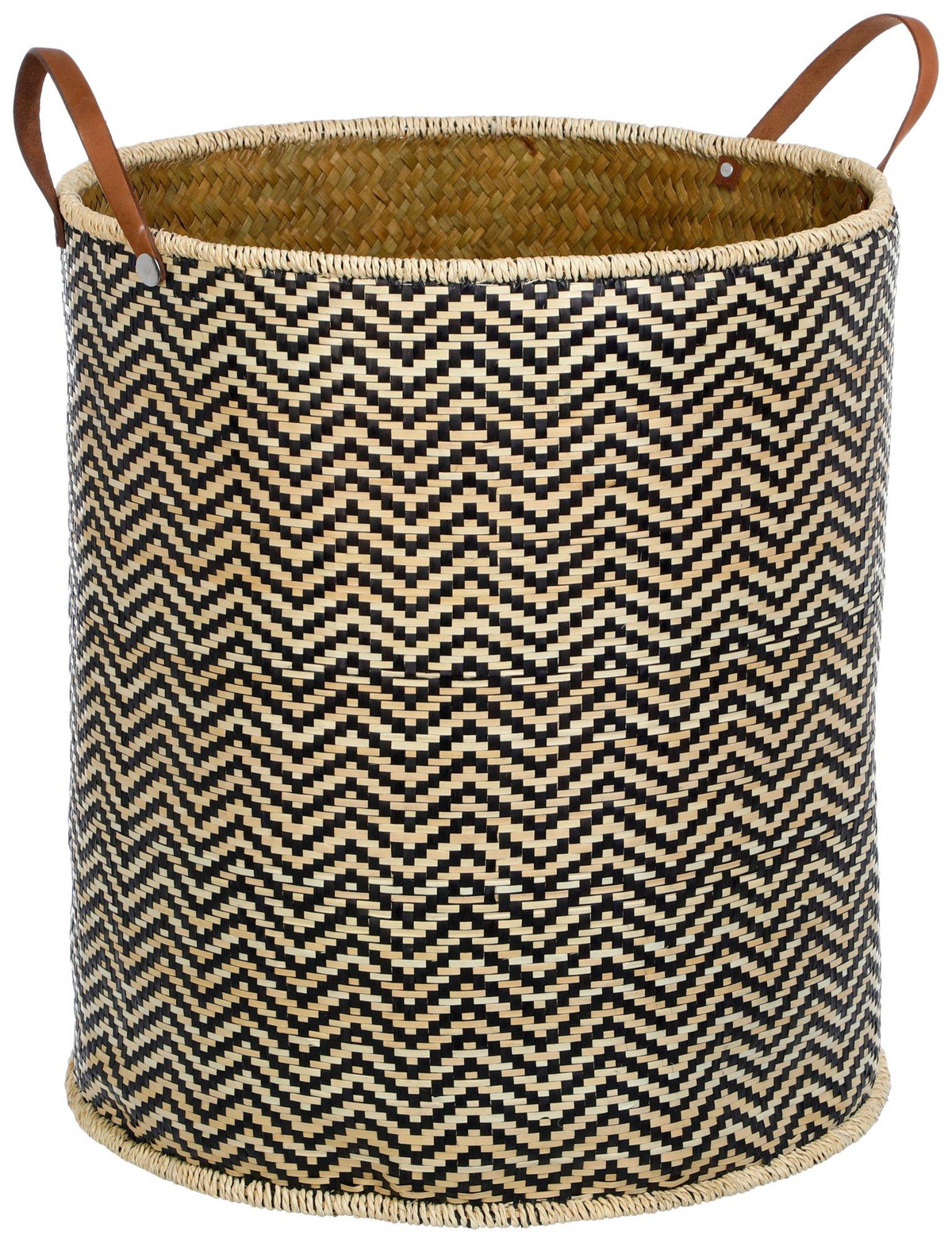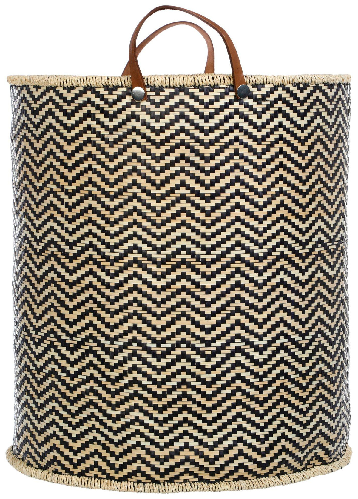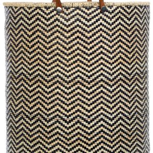 This round woven palm leaf basket showcases a detailed pattern that adds texture and depth to its natural charm. Designed with sleek faux leather handles, it blends rustic craftsmanship with modern flair. Ideal for organizing or decorating, this basket brings effortless style and function to any space. Measures approximately 17 in x 19.5 in. and 23 in. with handles.
