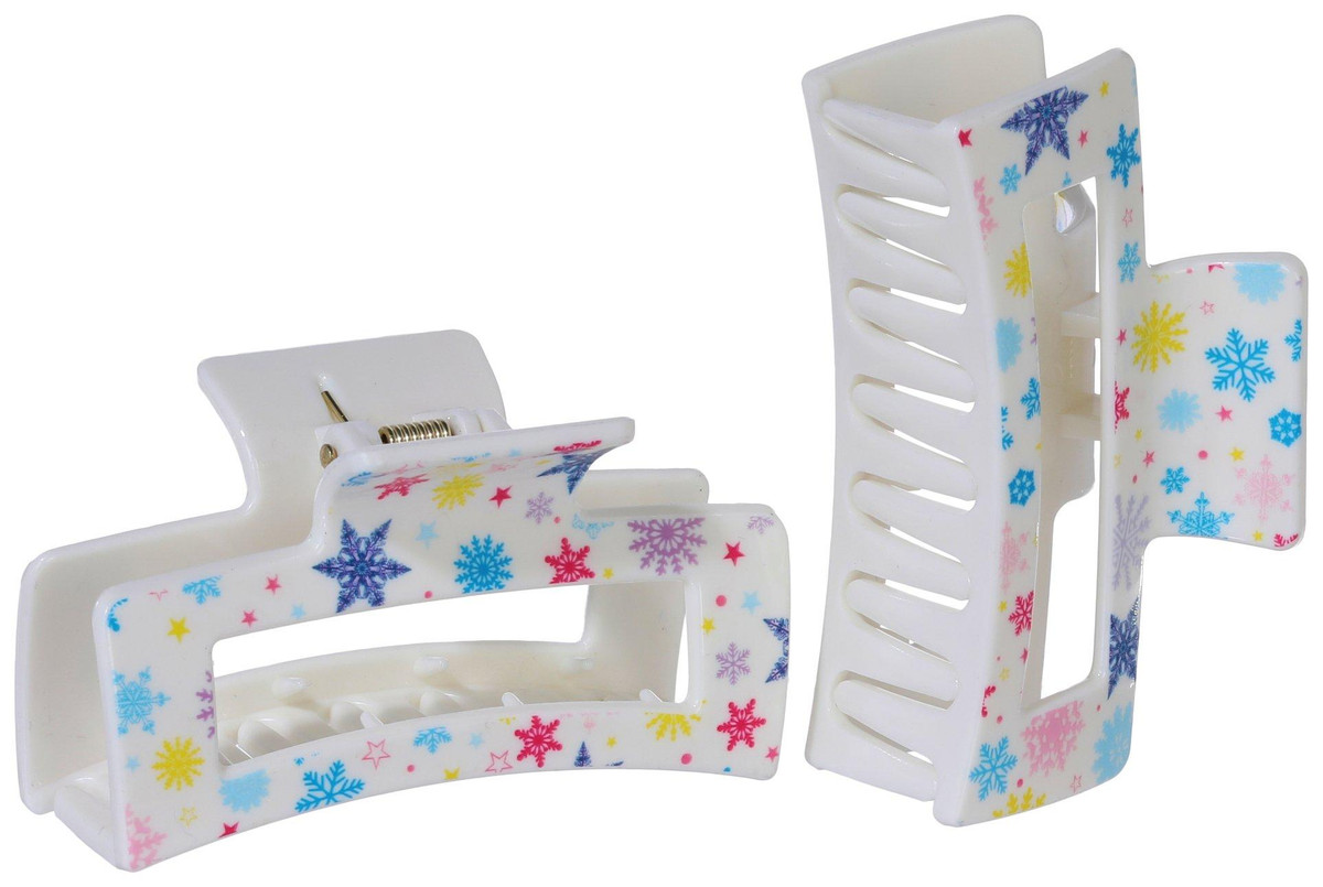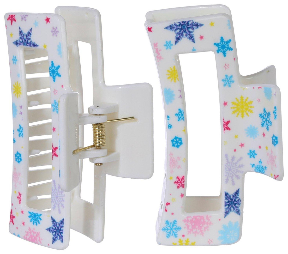 Add a playful winter sparkle to your hairstyle with this set of two claw clips. Each medium-sized clip features a white base adorned with multicolor stars and snowflake shapes, blending festive charm with everyday style. Designed for a secure hold and easy styling, they are perfect for seasonal flair or year-round fun.