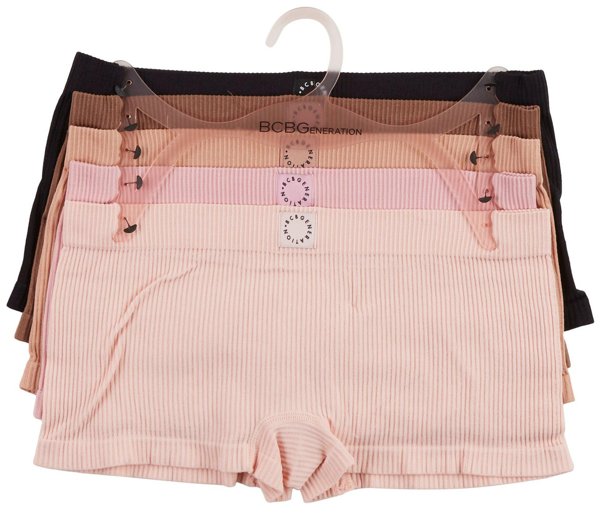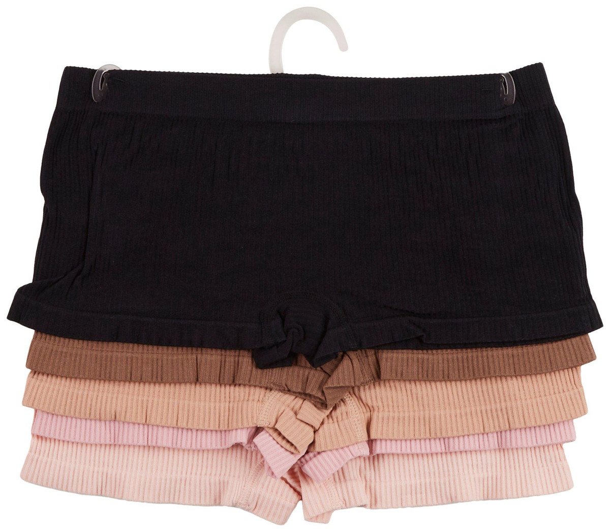 This 5 pack of ribbed boyshorts brings comfort and style to your everyday essentials. Made with soft, stretchy fabric that moves with you, each pair offers a flattering fit and breathable feel. The ribbed texture adds a touch of modern detail, while the full coverage design keeps you comfy from morning to night. Fabrication is 97% nylon, 3% spandex.