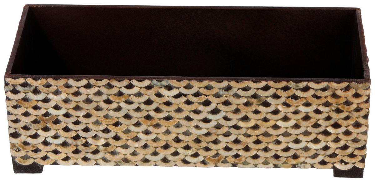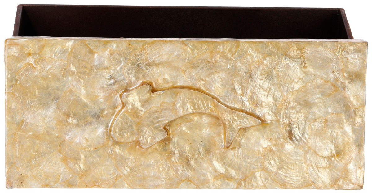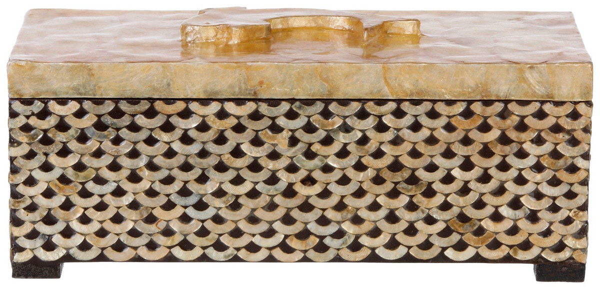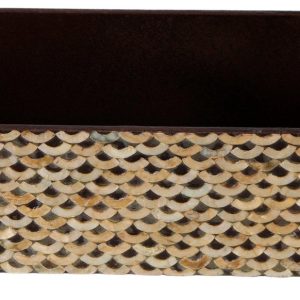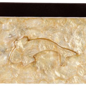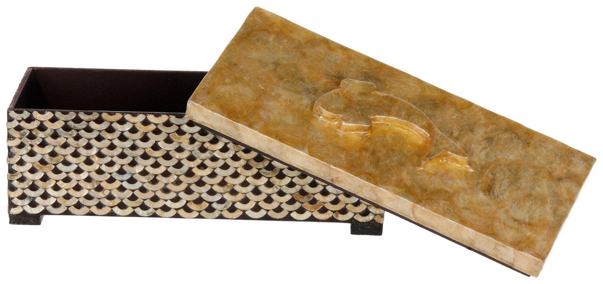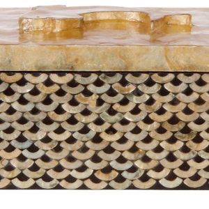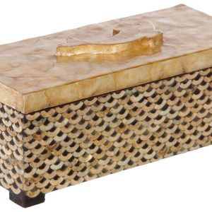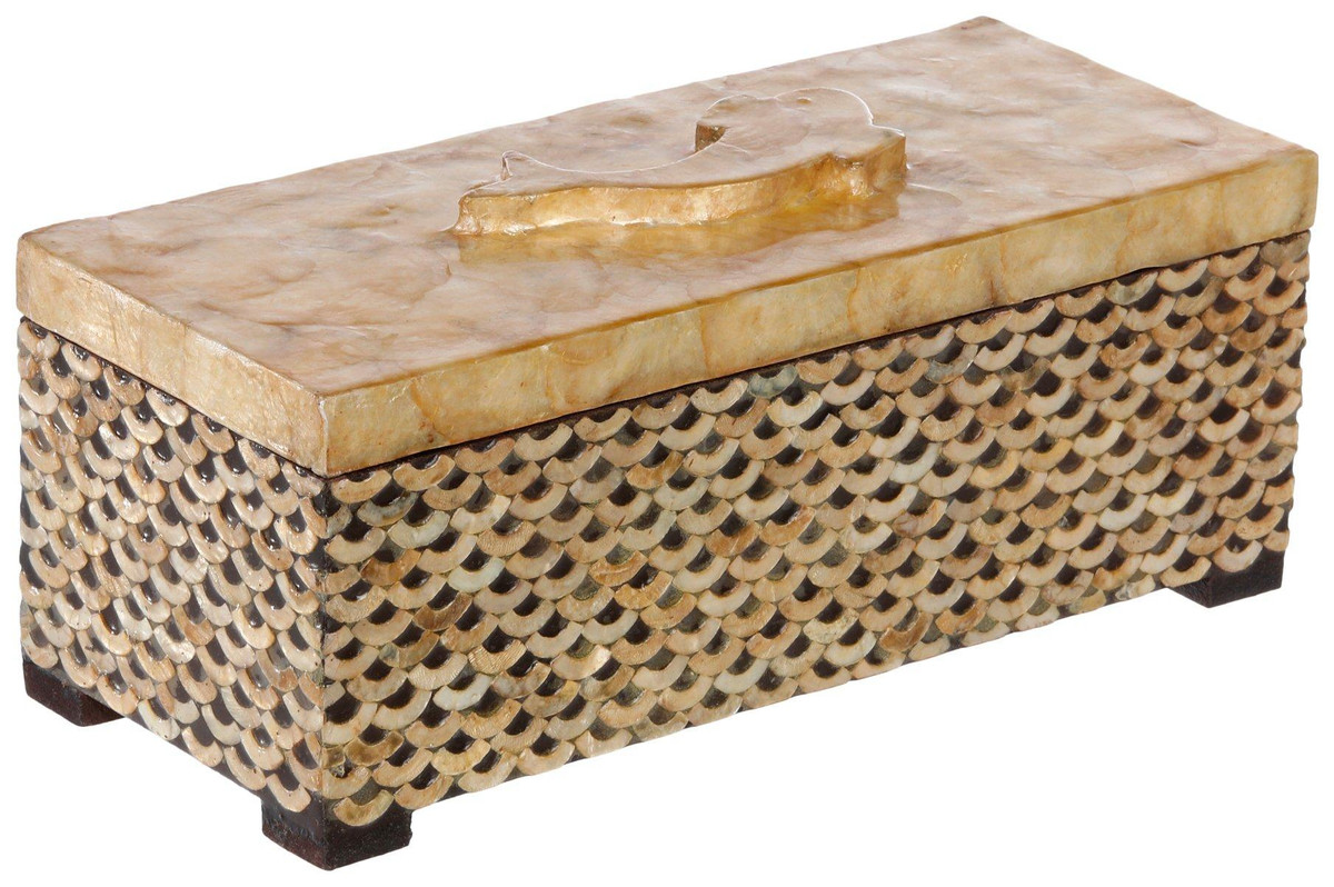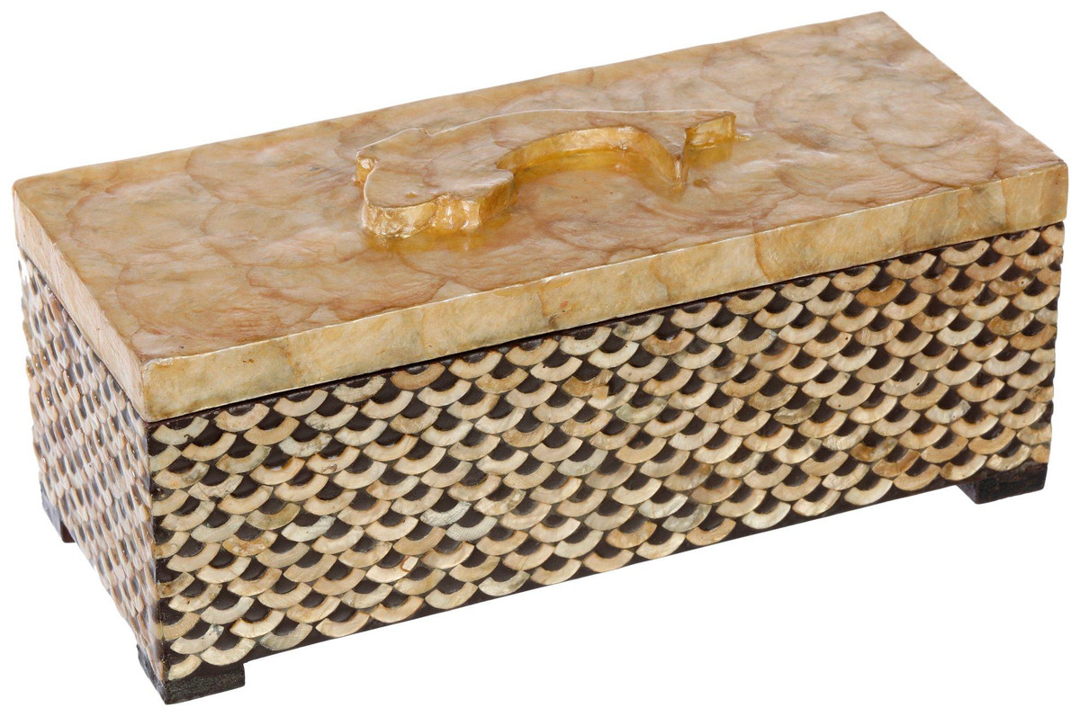 Add shimmer and coastal charm with the 12 inch Capiz Fish Scale Decorative Box. The top has a fish-shaped carving and iridescent shell-covered sides mimic the look of ocean scales, all set on a sturdy wood base. Perfect for storing keepsakes or jewelry, its a stylish accent for vanities, dressers or coastal-themed spaces. Measures approximately 12 in x 5 in x 5 in.