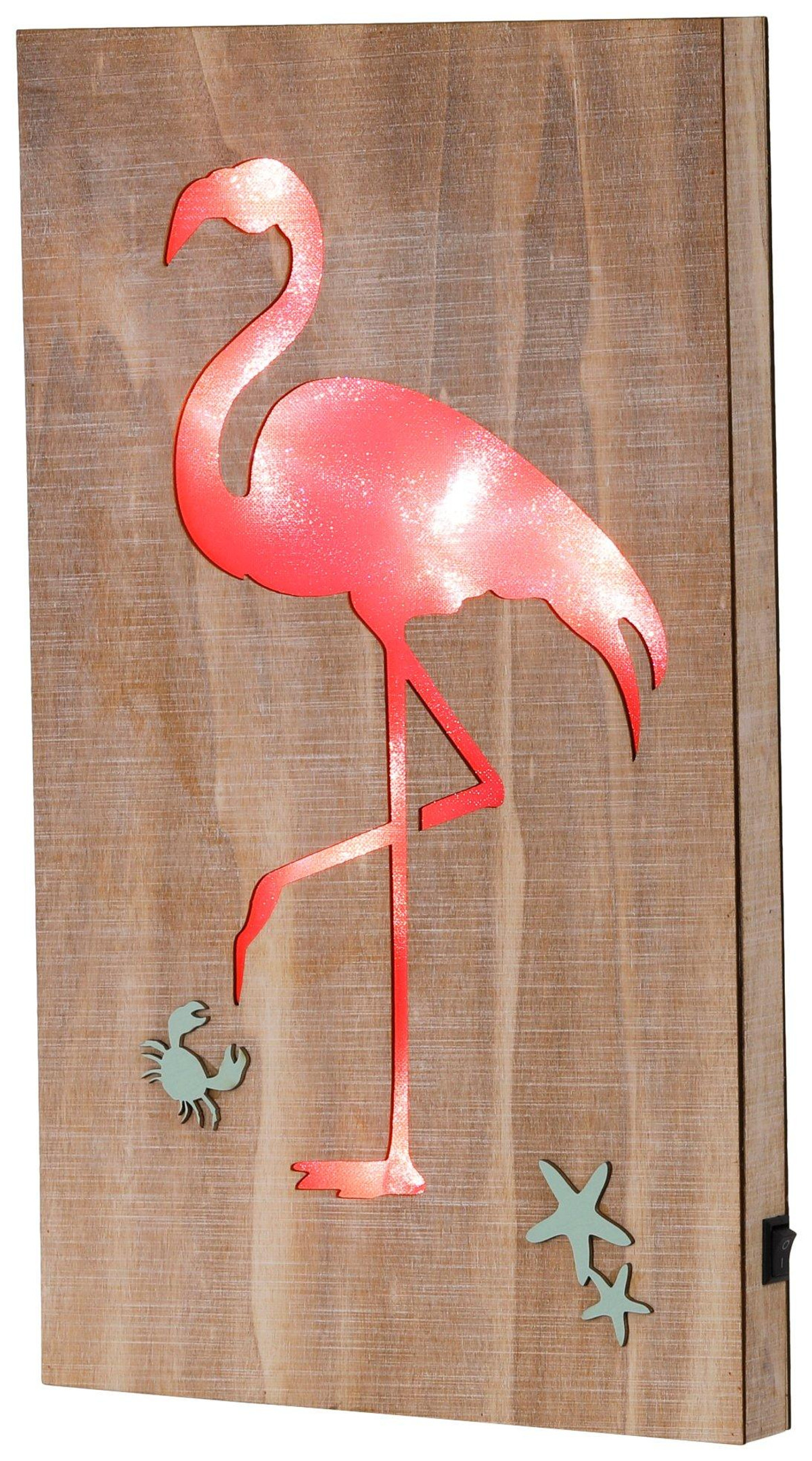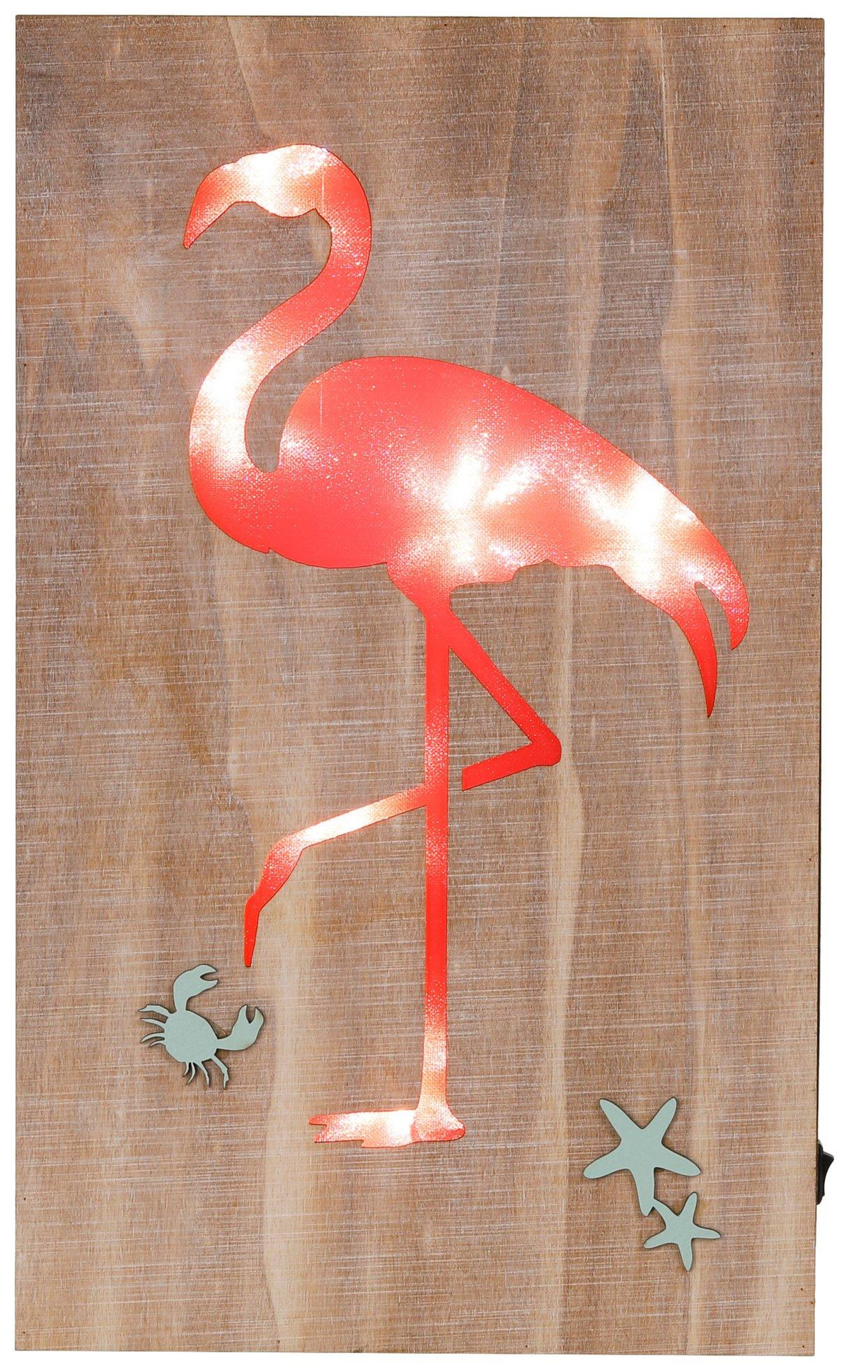 Bring tropical vibes home with this Light-Up LED Flamingo Coastal plaque. Facing left and measuring 10.5 x 17.25 x 1.5 inches, this wooden wall hanging adds a playful beachy touch to any roomkitchen, bedroom, patio, or hallway. Easy to hang and glowing with LED charm, its the perfect coastal décor piece or gift for anyone who loves the surf and sand.