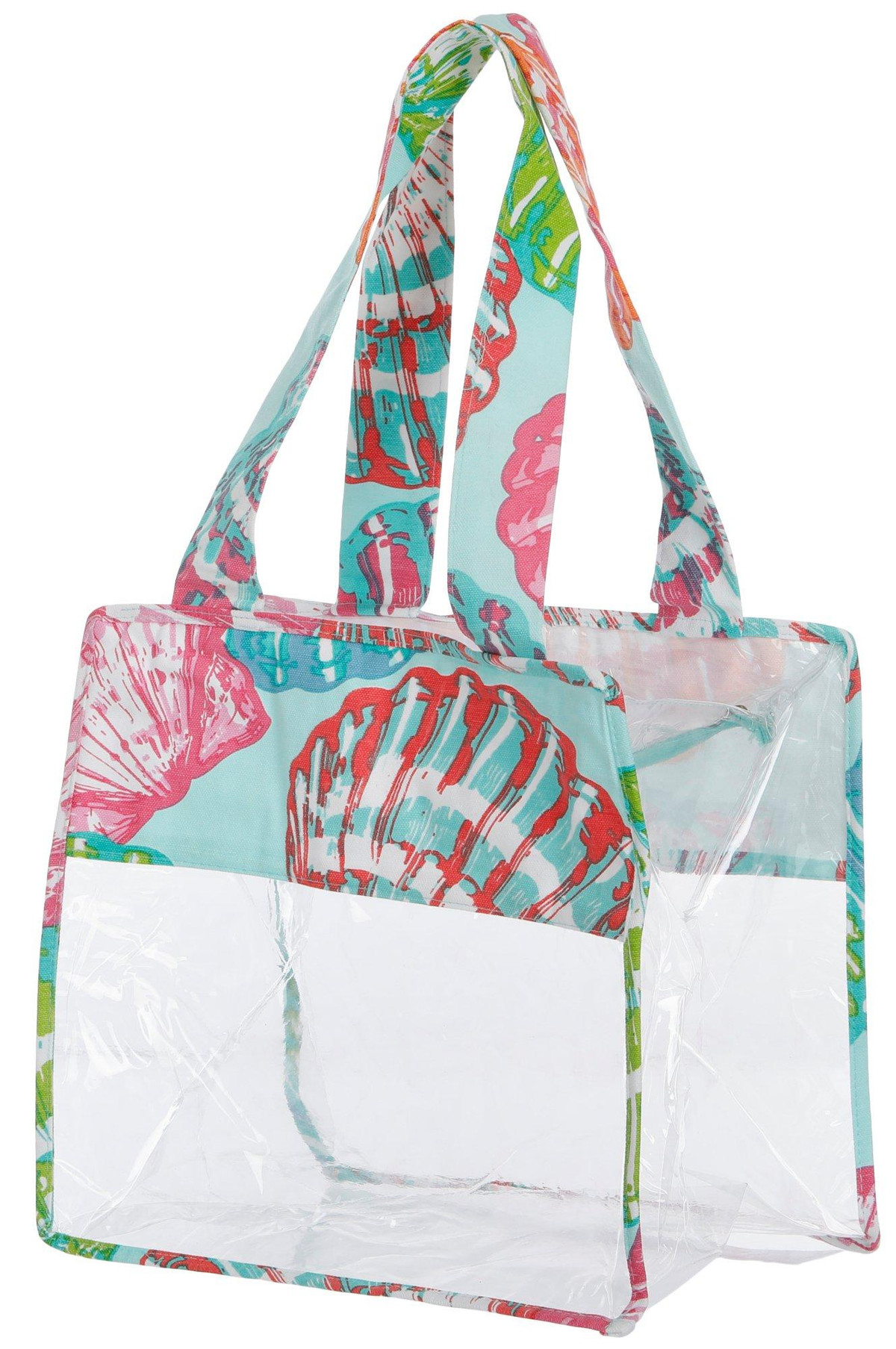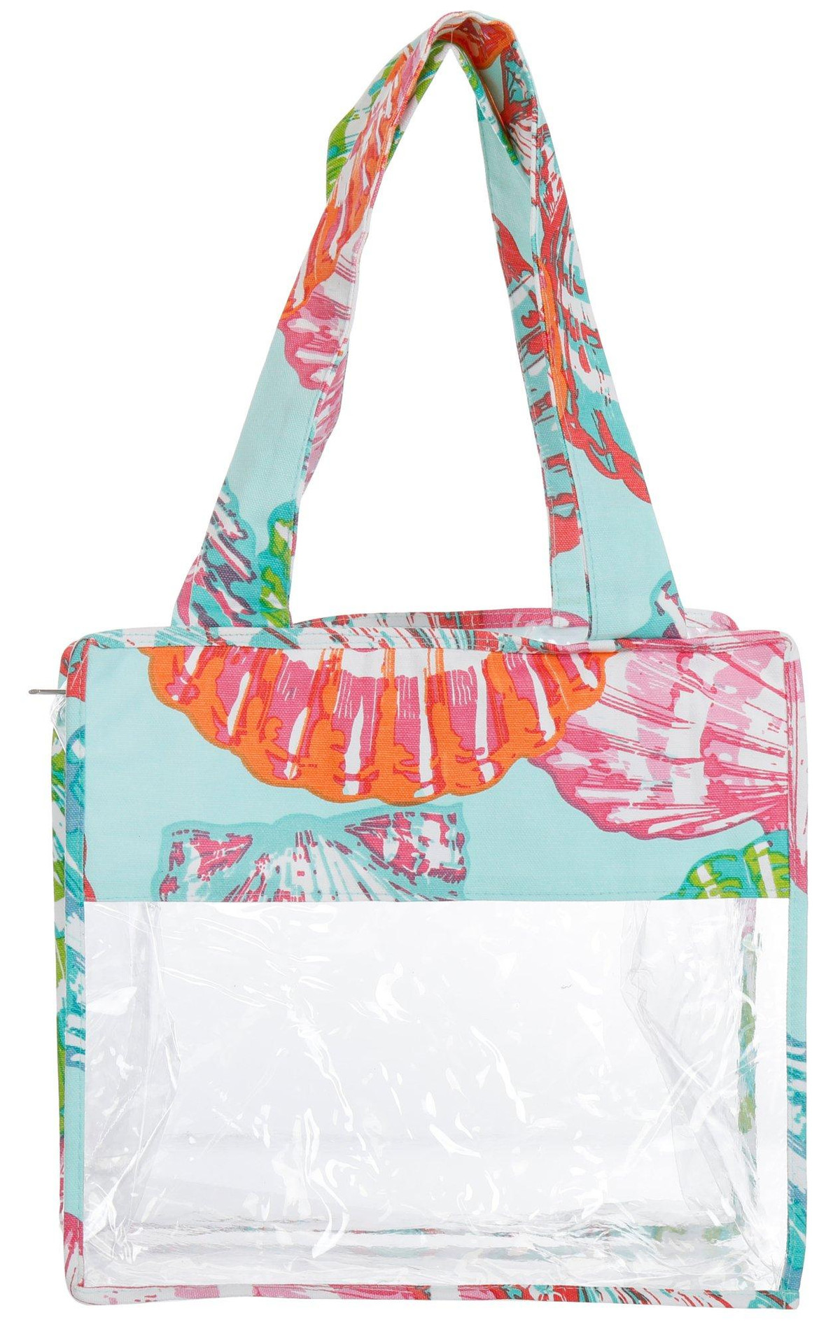 Stay event ready with this Outdoor Clear Shell Stadium Tote Bag, designed with a transparent body and floral fabric trim for style and compliance. Features fabric top and handles for comfortable carrying at games, concerts, or the beach. Fabrication includes clear PVC and polyester. Measures approximately 12 in x 9.5 in x 12 in.