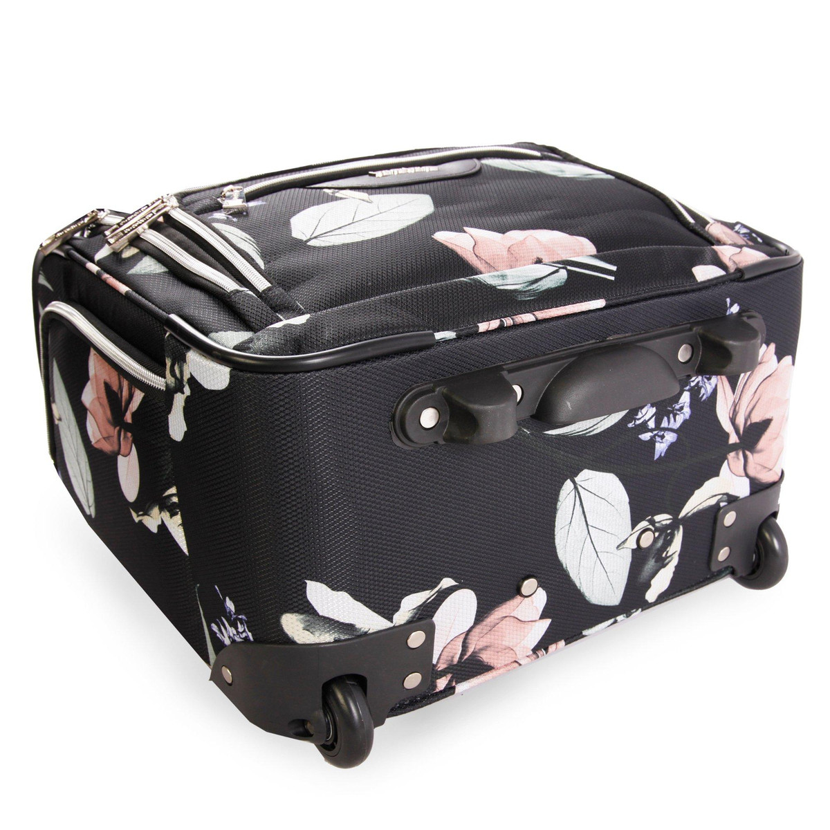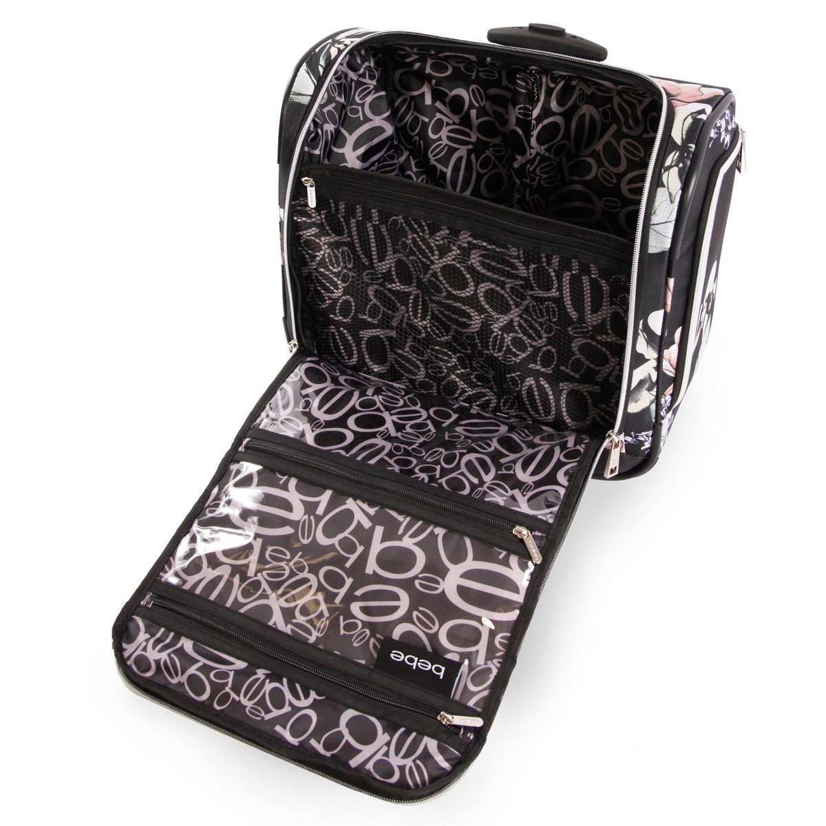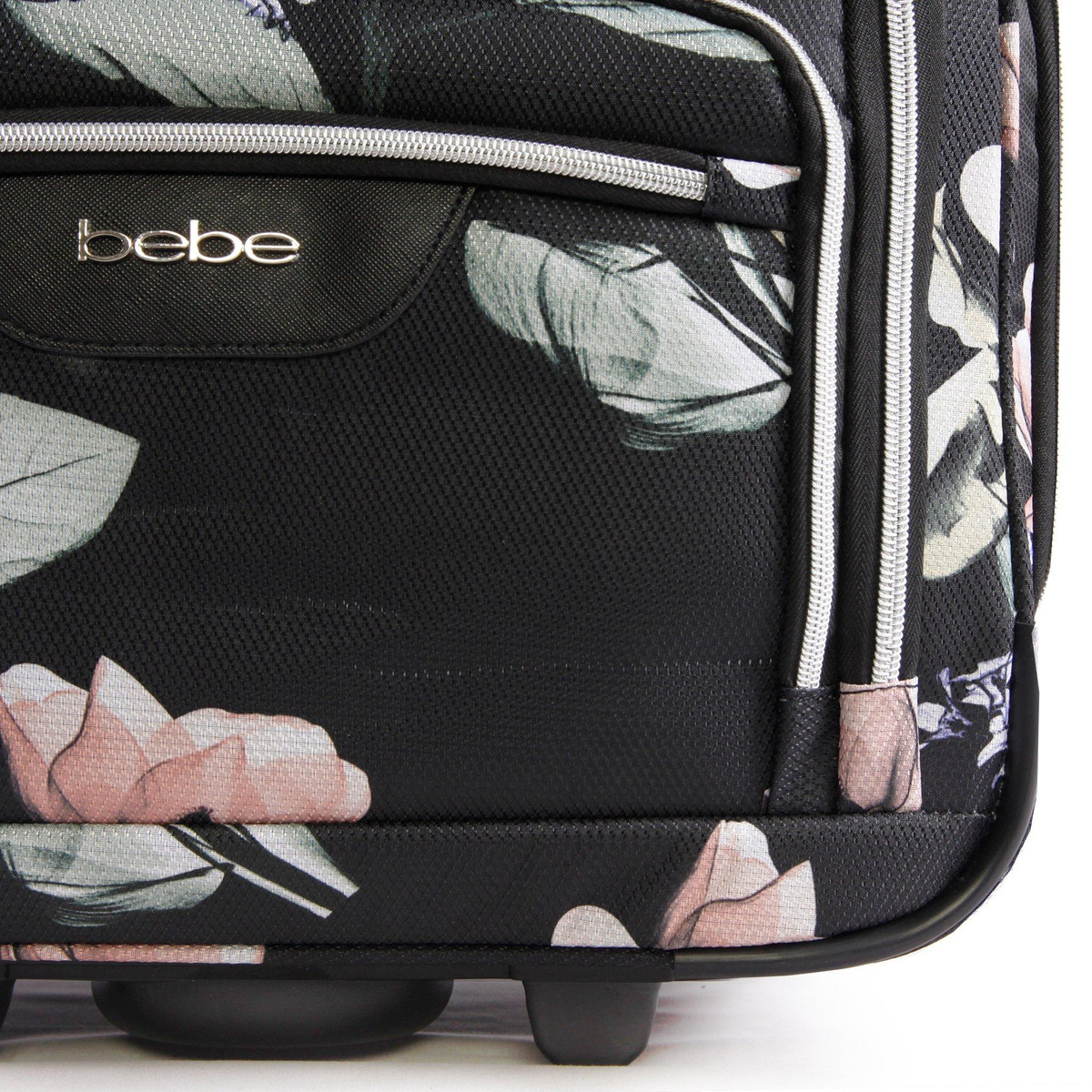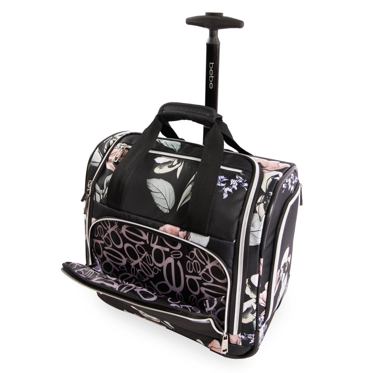 Travel in style with the Bebe Valentina under the seat luggage. Compact in size, it provides useful storage space, a telescoping handle and smooth rolling wheels. This carry-on bag is designed to fit underneath most airline seats, so you can access everything you need while flying. Suitcase measures 15 in. x 15 in. x 8.5 in.