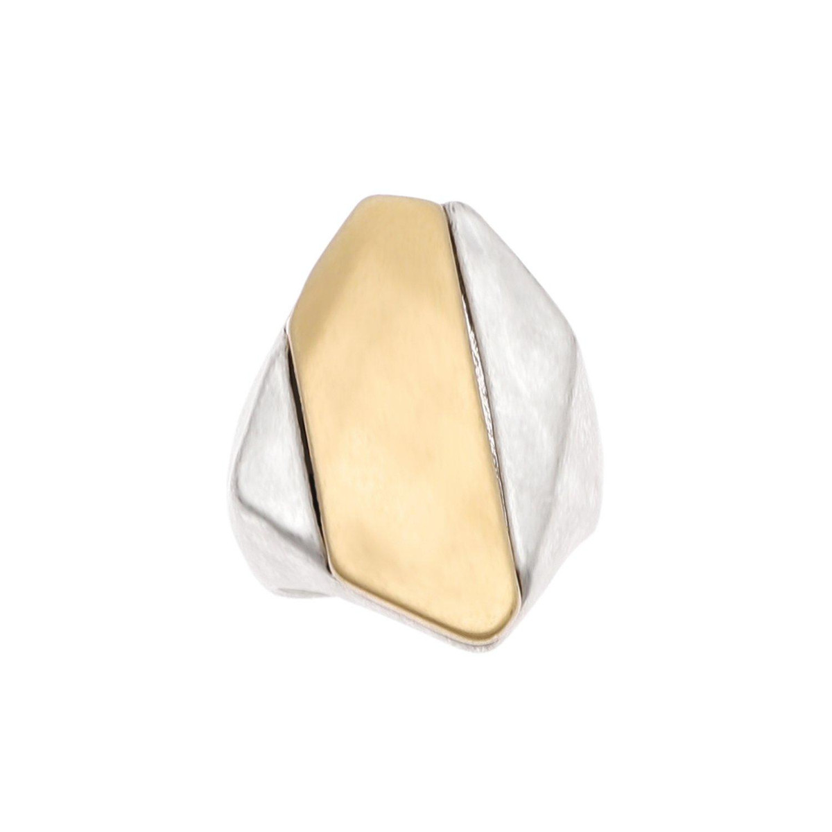 The Bella Uno Two-Tone Diamond-Shaped Ring features a striking diamond-shaped design with a sophisticated mix of silver and gold-tone finishes. Its bold yet elegant style makes it a perfect statement piece, adding a touch of luxury and modern flair to any outfit. Ideal for both casual and formal occasions.