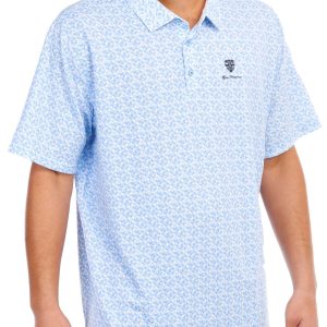 Look your very best, whether out on the course or around town, in this super stylish short sleeve sport polo. It features an eye-catching geometric print pattern design, collared polo style neckline, and super soft breathable fabric. Fabrication is 62% polyester, 33% rayon, and 5% spandex.