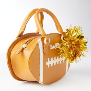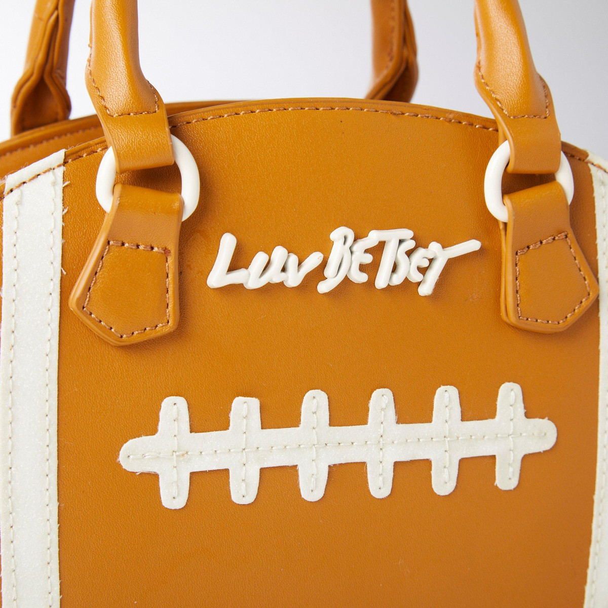 Score major style points with this Luv Betsey football crossbody. Designed with double handles and a removable strap, it features embroidered finger placement details for a sporty touch. A playful cheer pom pom adds extra flair, making this bag a total touchdown for game day or everyday fun.