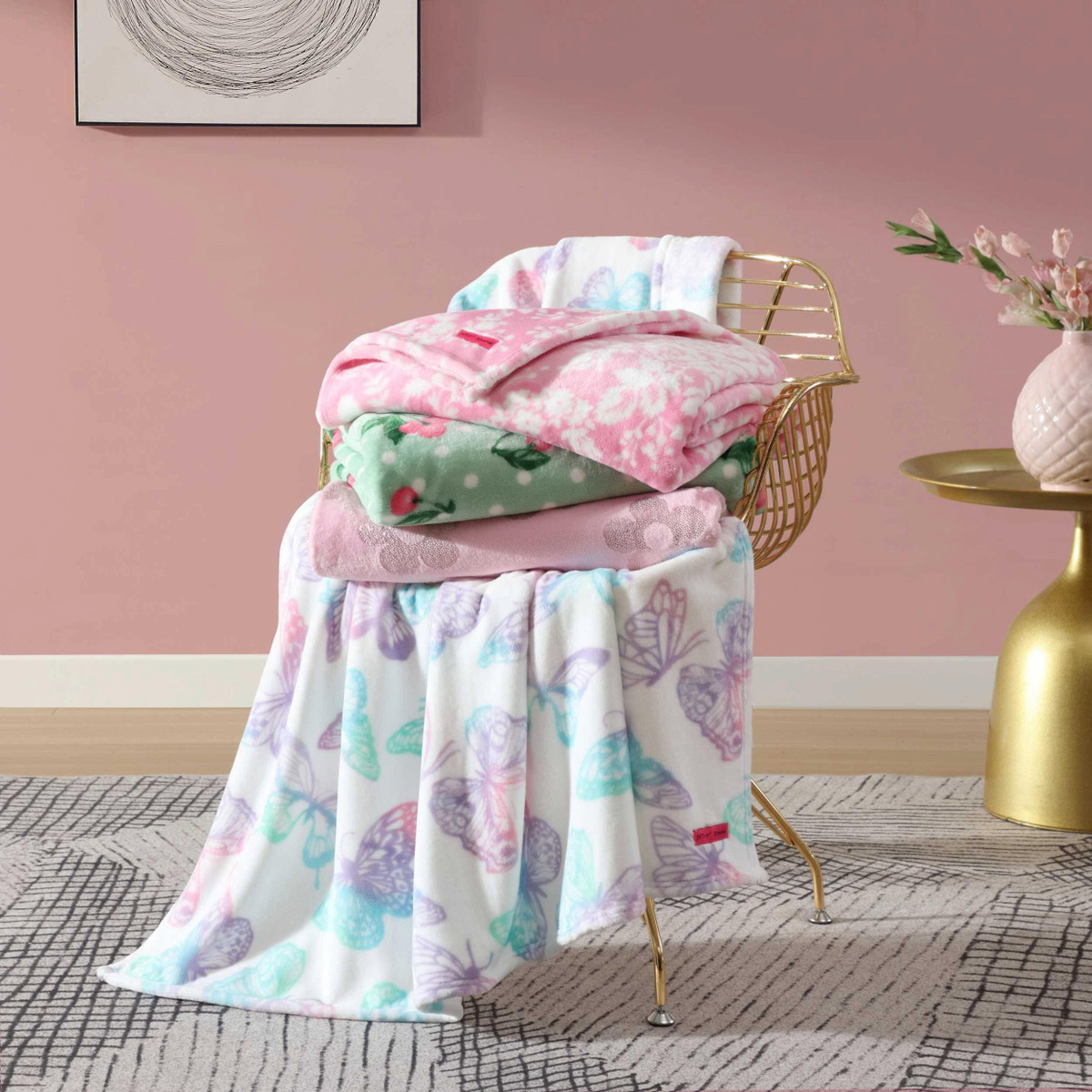 Snuggle up in style with the Betsey Johnson Malachite Butterfly throw! Pink butterflies flit across a soft pink fleece like a daydream in flight. Lightweight yet oh-so-cozy at 300 gsm, this plush wonder is perfect for couch cocooning or bed layering. Made of 100% polyester, it is your go-to for fun, flair, and full-body comfort. Get ready to relax, giggle, and get cozy! Machine washable for easy care.