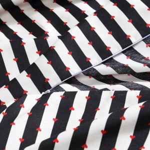 Make a bold, romantic statement with the Betsey Johnson Wonderland Stripe Duvet Cover Set. Featuring striking black-and-white stripes with playful red hearts, this ultra-soft polyester set adds drama and charm. Lightweight for year-round comfort, it includes a duvet cover with a zip closure, corner ties, and matching shams for a chic, polished look. Machine washable for easy care.