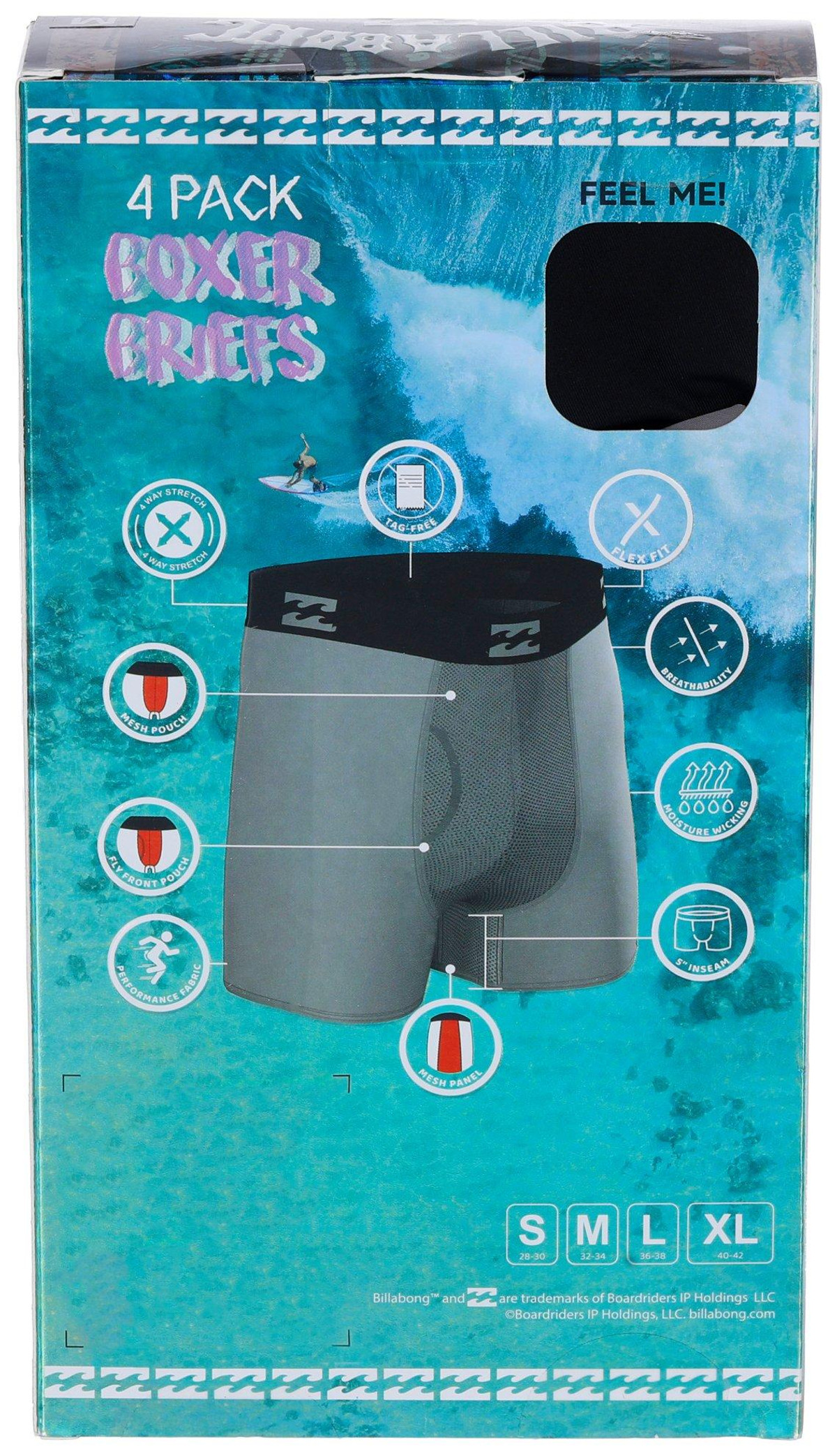 Stay cool and supported with this Mens 4 Pk Solid Boxer Briefs. Crafted from a breathable performance fabric blend, each pair features a fly front mesh pouch, moisture-wicking properties, and a flex fit design for all-day comfort. Ideal for workouts, travel, or everyday wear. Machine washable for easy care. Fabrication is 80% nylon, 20% spandex or 20% elastane. .