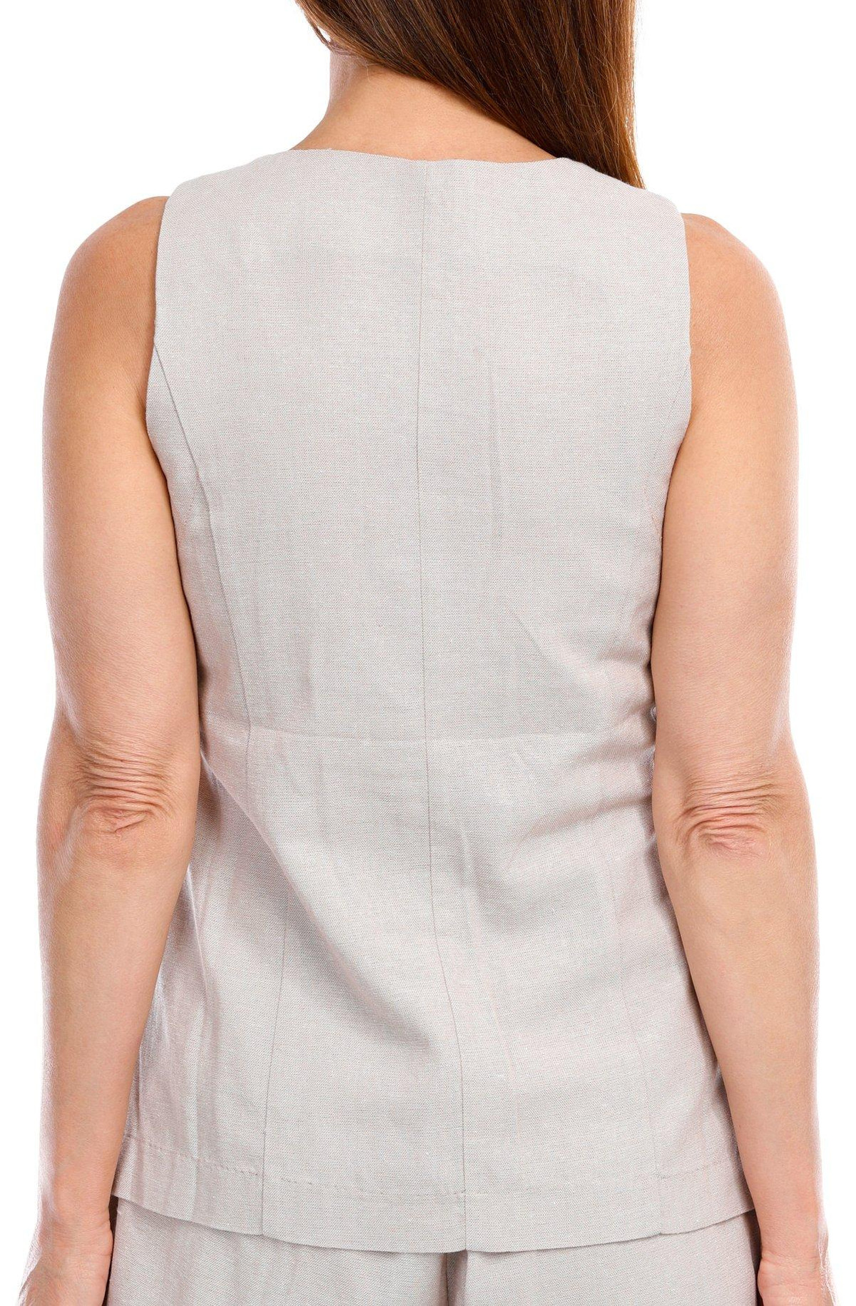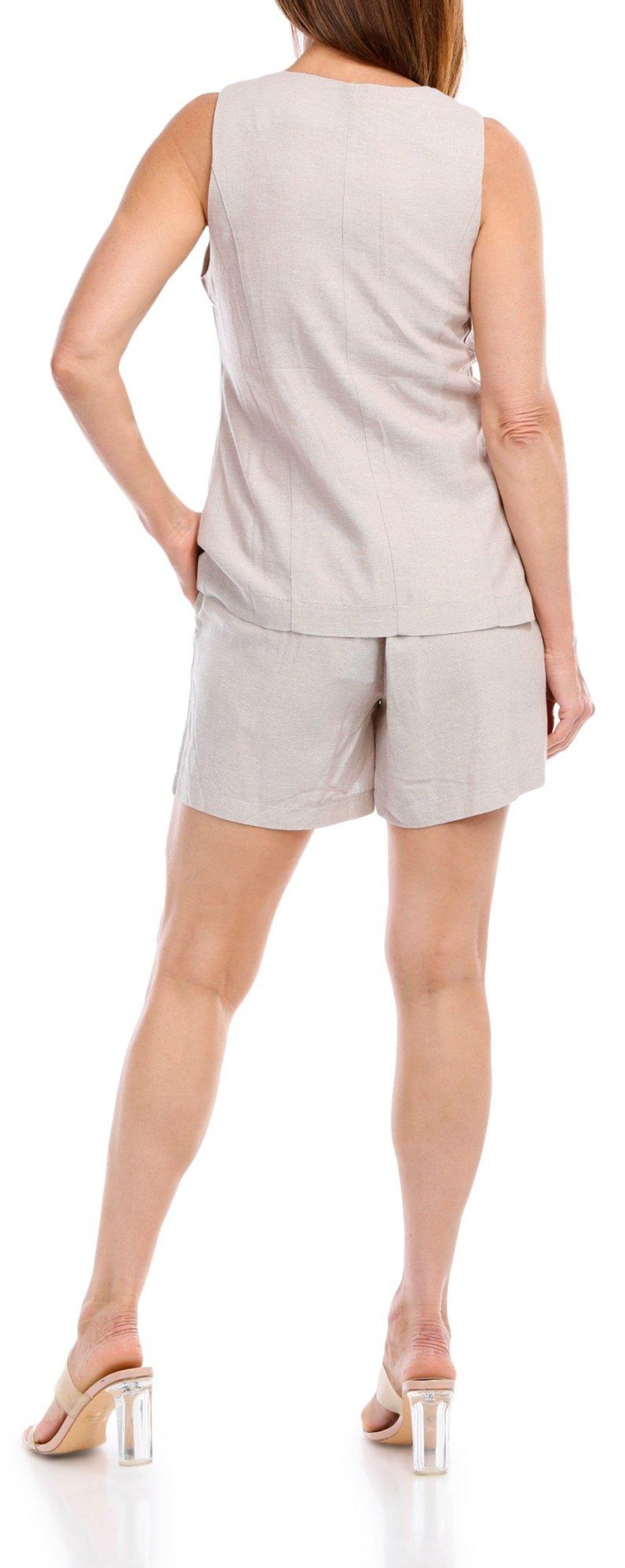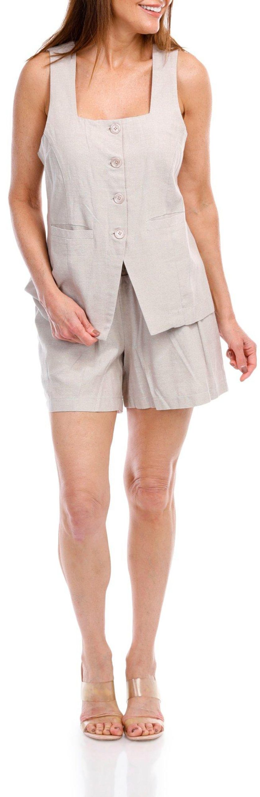 Enhance your ensemble with our Sleeveless Buttoned Vest, a versatile piece in a solid color that complements any outfit. The double front faux pockets add a stylish touch, giving the vest a sophisticated look without compromising on elegance. Perfect for layering over shirts or dresses, this vest is a must-have for adding a polished finish to your wardrobe. Fabrication is 80% rayon and 20% linen.