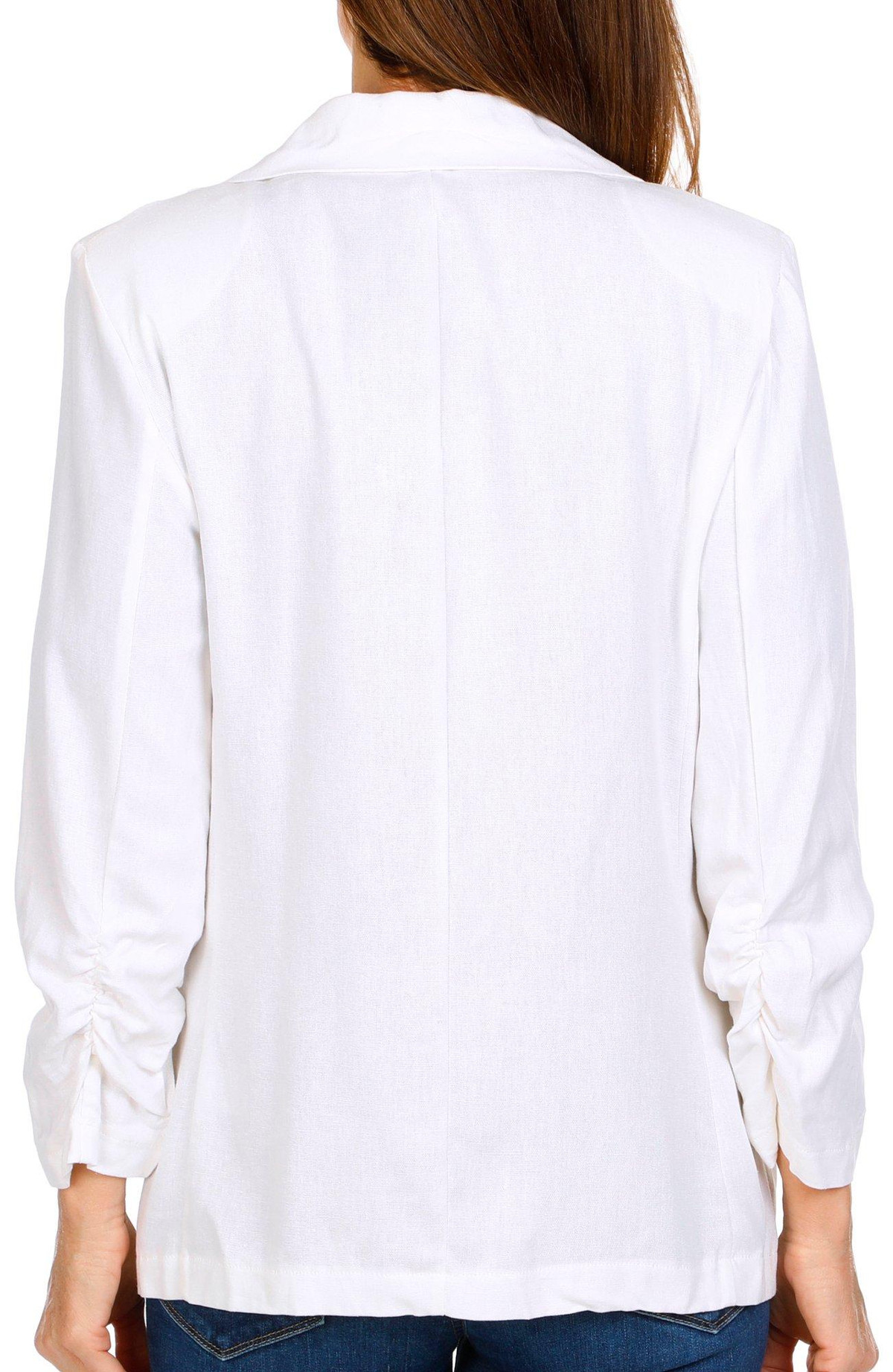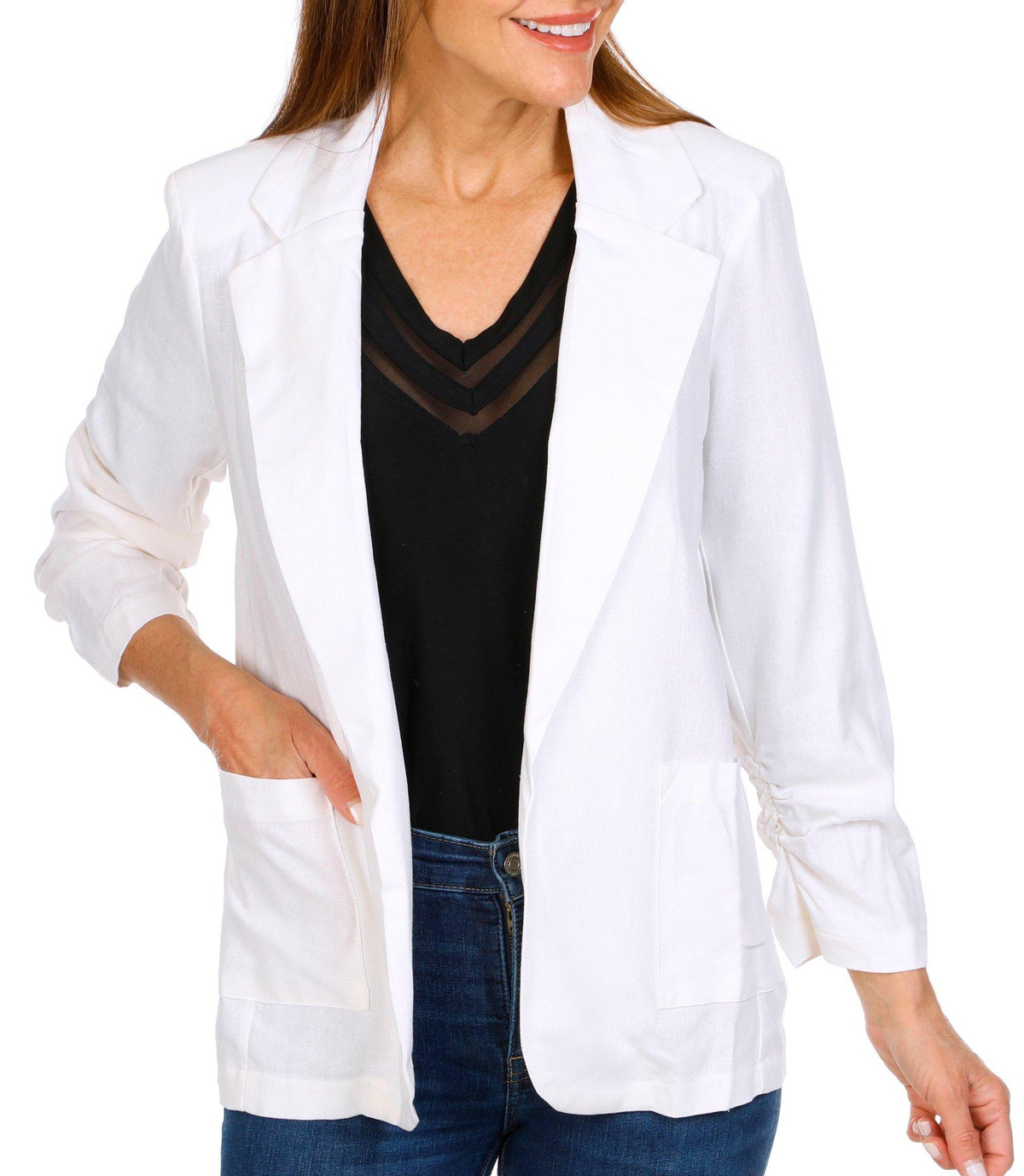 Step up your style game with our Solid Long Sleeve Blazer Jacket. This sophisticated piece features patch pockets for a touch of practicality, while the ruched sleeve details add a modern twist. The padded shoulders provide a structured silhouette, ensuring you look sharp and confident. Perfect for both professional and casual settings, this blazer is a versatile addition to your wardrobe. Fabrication is 80% rayon and 20% linen.