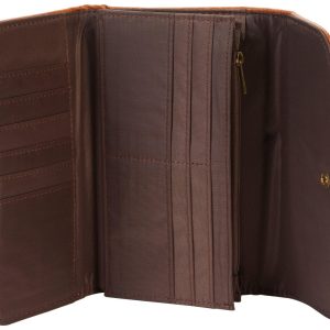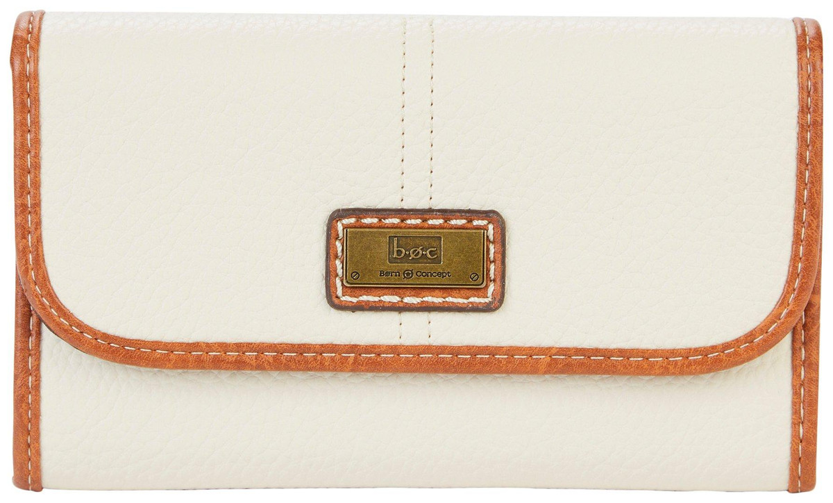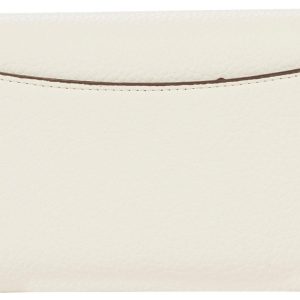 This Boc zipper wallet combines practicality with style in white pebble leather and brown trim. It includes an inner zipper pocket, multiple card holders, and an exterior pocket for quick access to essentials.
