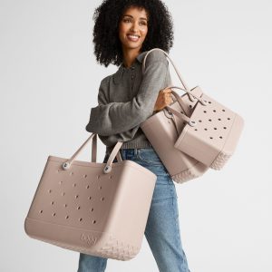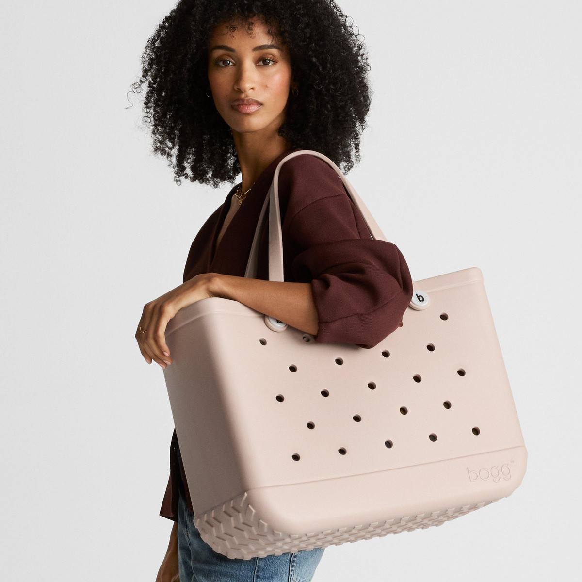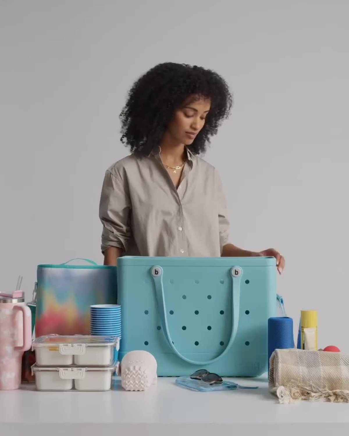 This Bogg Beach Tote Bag features a solid color design on a sturdy EVA fabrication with perforated sides, a durable pebbled bottom, and dual strap handles. Bag is durable, washable, sturdy, and tip-proof. Measures approximately 19 in x 9.5 in x 15 in.