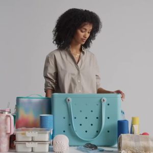 This Bogg Beach Tote Bag features a solid color design on a sturdy EVA fabrication with perforated sides, a durable pebbled bottom, and dual strap handles. Bag is durable, washable, sturdy, and tip-proof. Measures approximately 19 in x 9.5 in x 15 in.