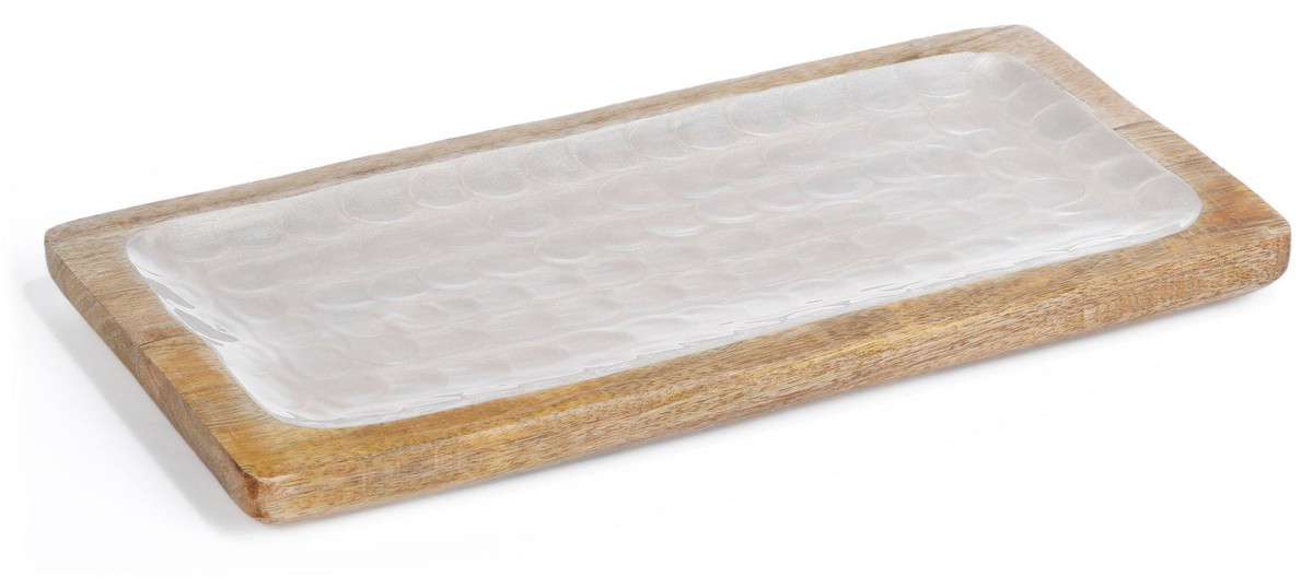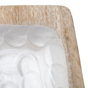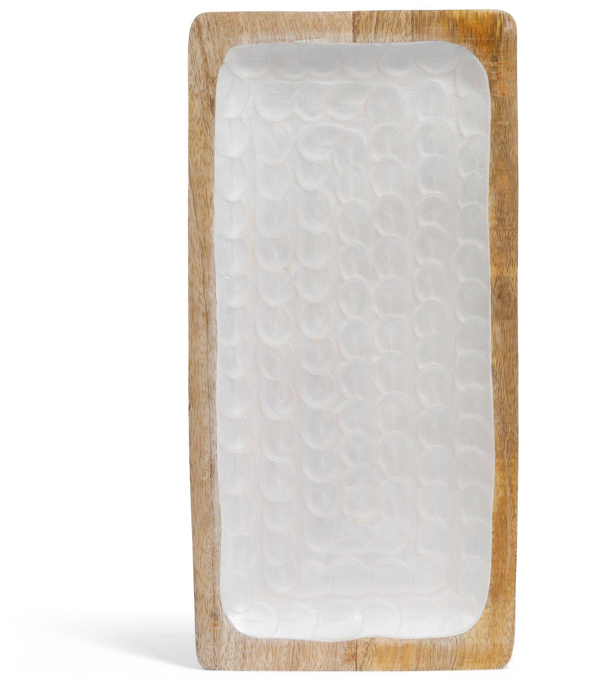 Elevate your entertaining experience with this stunning Mother of Pearl Shell and Wood Serving Tray. This exquisite tray showcases the natural beauty of mother of pearl, meticulously arranged over the wood to create a shimmering, iridescent surface that catches the light beautifully. The sturdy wood tray makes it perfect for serving drinks, appetizers, or desserts with a touch of coastal sophistication. Measures approximately 14 in x 7 in x 1 in.