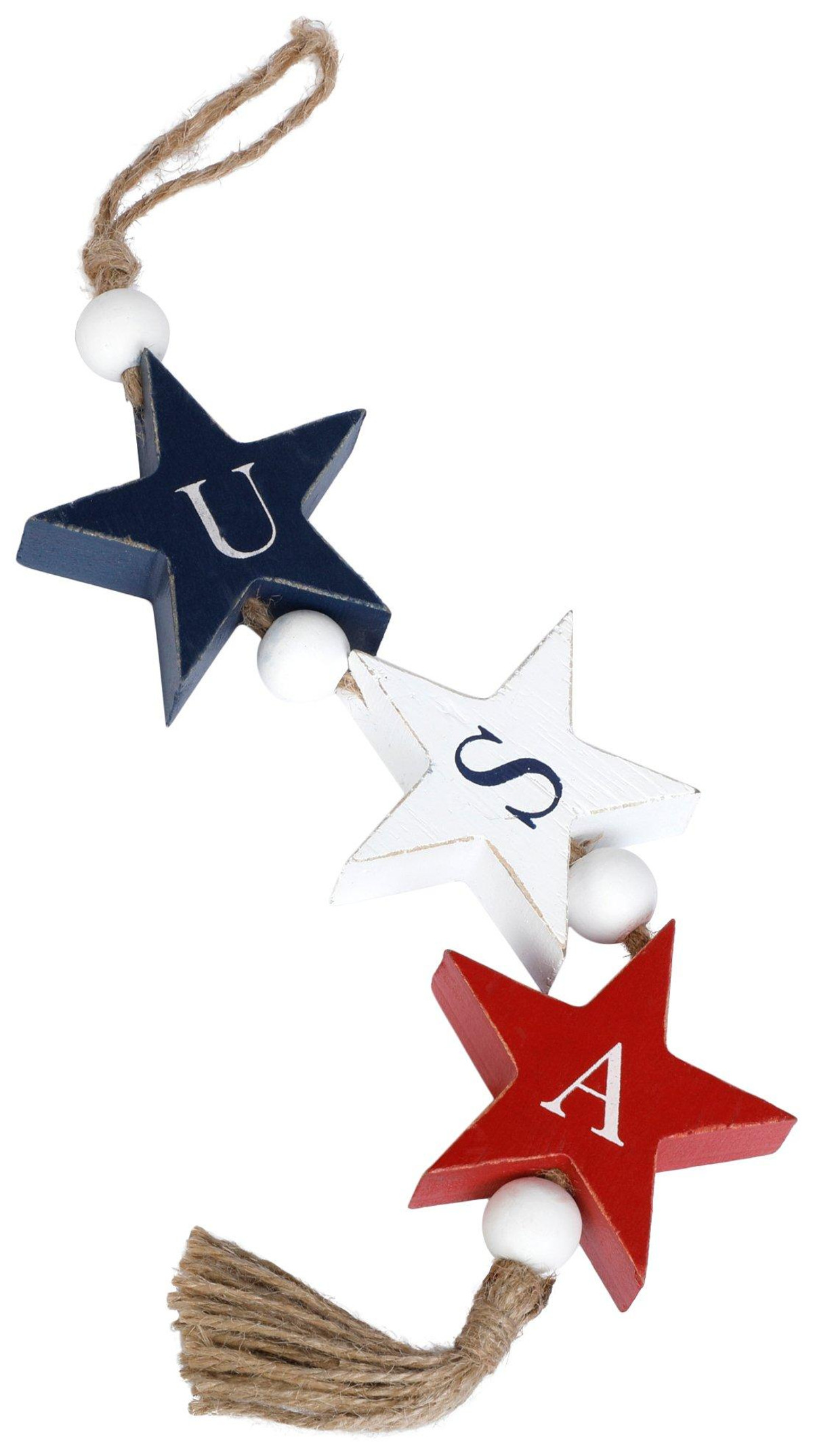 This delightful string of beads evokes a sense of national pride and unity, perfect for celebrating the United States with its vibrant colors and iconic map detail. USA decor, patriotic decoration, American pride, red white and blue, home decor, national symbols, July 4th decoration, Independence Day celebration, festive beads, decorative garland. Measures 33 in x 3 in.