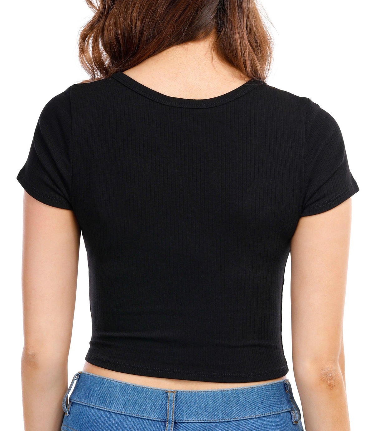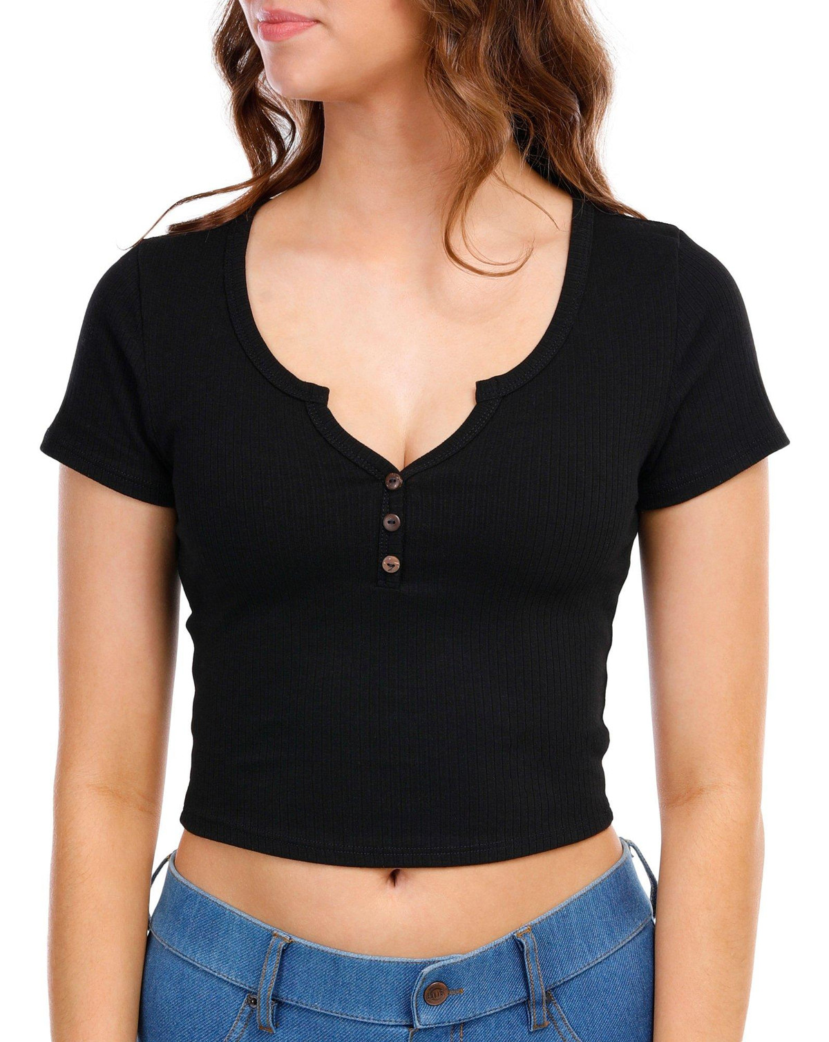 The Juniors Ribbed Henley Crop Top, made from a blend of cotton, polyester, and spandex, features a Henley neckline and a solid ribbed exterior. With its cropped length and short sleeves, this top offers a stylish and comfortable option, perfect for any casual outing or layering piece.
