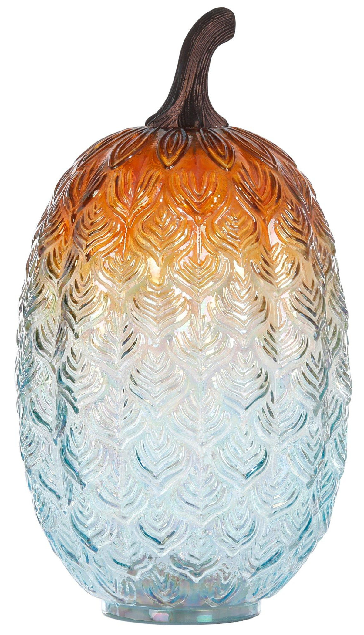 Add a warm glow to your décor with this 14 in LED Glass Pumpkin Home Accent. Featuring an embossed feather pattern, this elegant glass pumpkin is illuminated from within by LED lights for a soft, ambient effect. Ideal for autumn displays, mantel styling, or festive centerpieces. Wipe clean with a dry cloth.