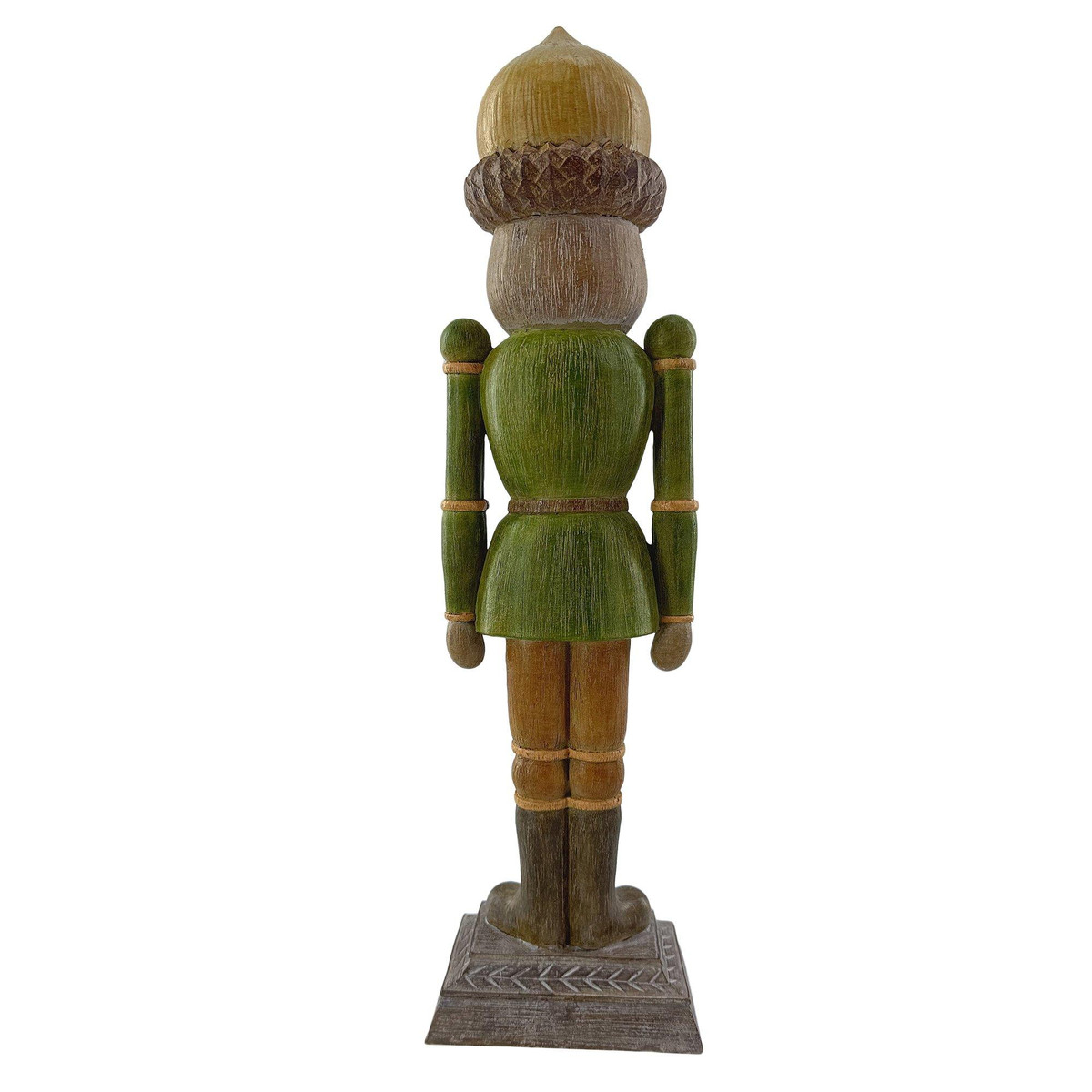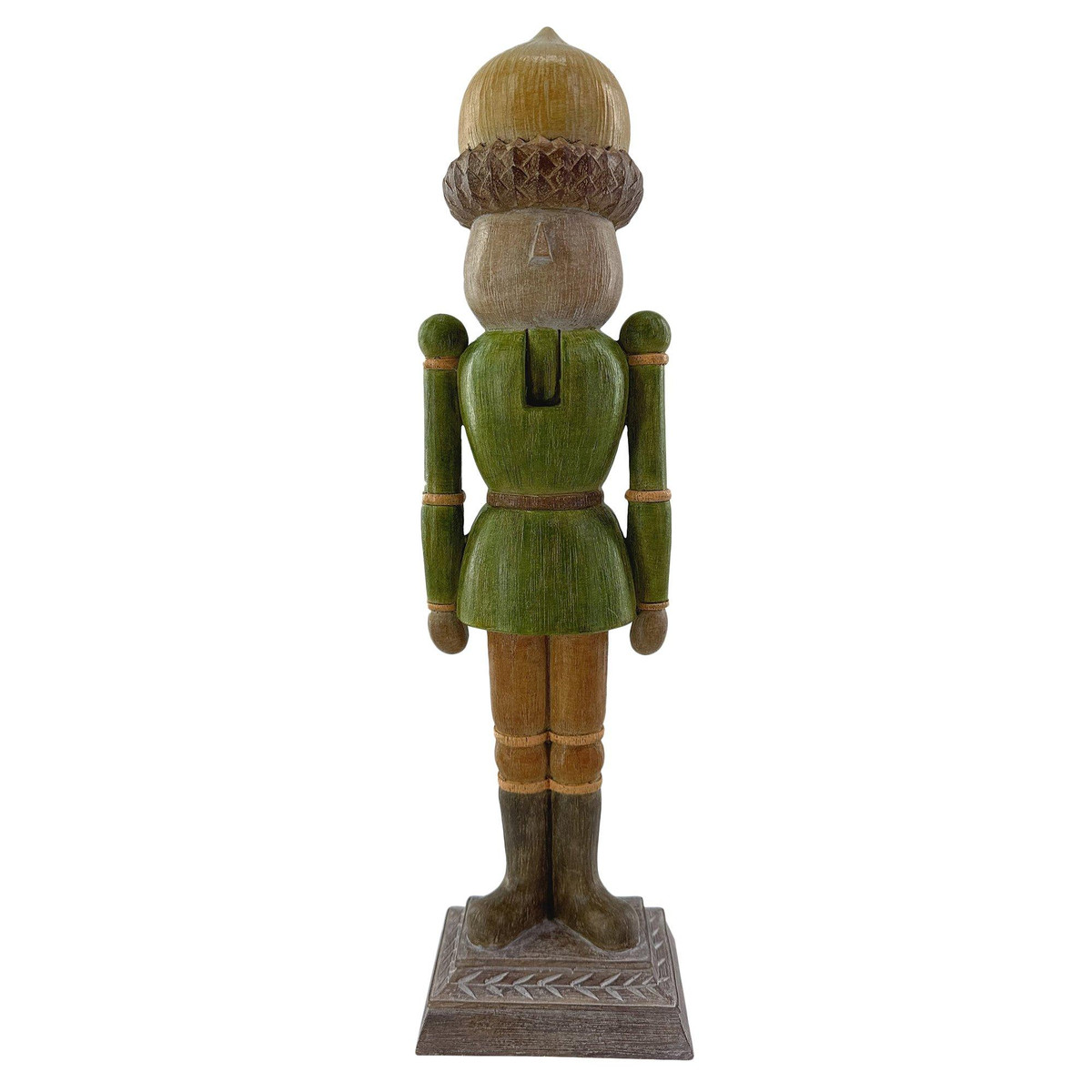 Celebrate the season with this unique 16.5 woodgrain-style nutcracker, featuring a charming acorn-shaped hat. Dressed in earthy green and brown tones, the figure stands on a sturdy dark square base and is crafted from durable resin. With its textured detailing and fall-inspired design, it makes a whimsical addition to autumn or Thanksgiving décor. Measures: 4.75in. x 3.25in. x 16.5in.