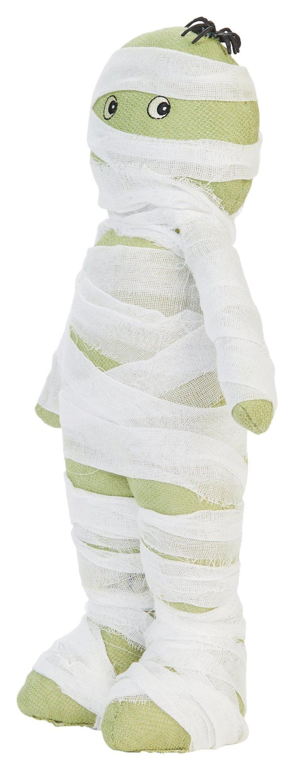 Add eerie charm to your setup with this 18 in Standing Mummy Halloween Decor. Wrapped in textured gauze and detailed with a small spider perched on its head, this figure brings classic Halloween character to mantels, entryways or tabletops. Lightweight and freestanding for easy placement. For indoor seasonal display only. Dust gently to maintain appearance. Measures approximately 18 in x 11 in x 4 in.