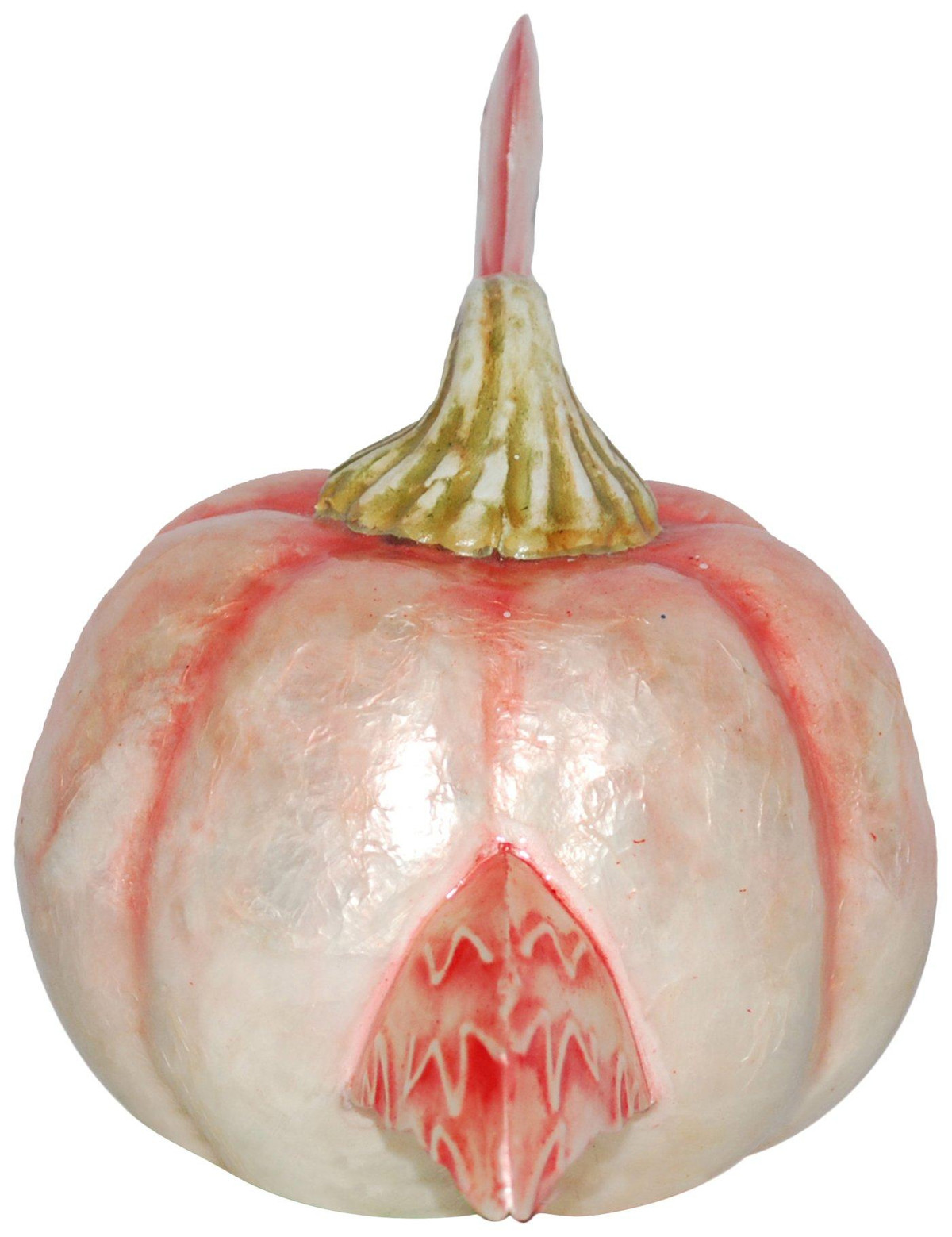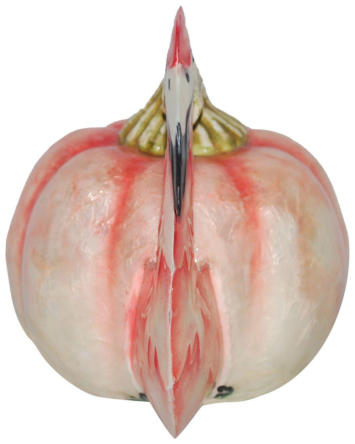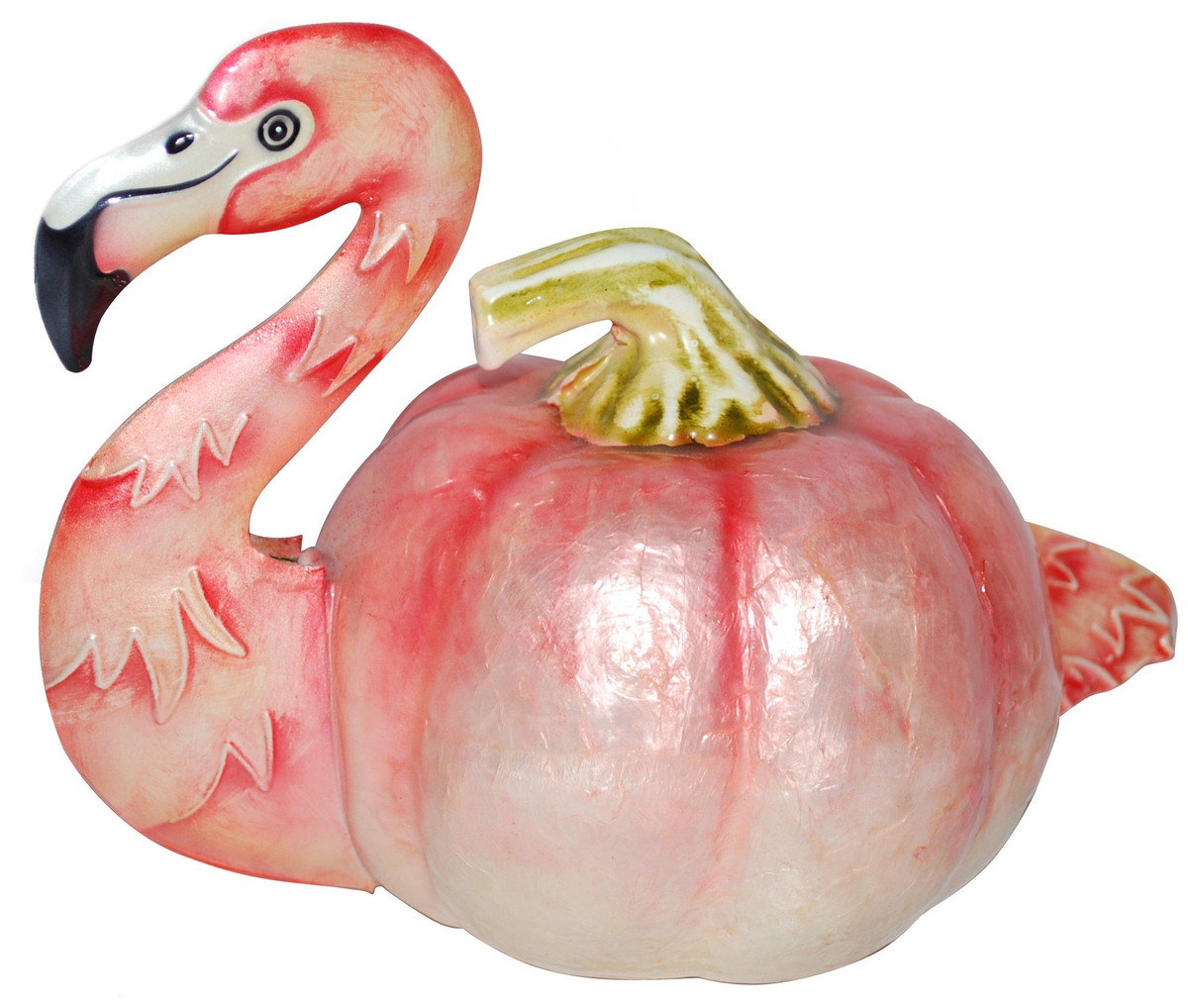 This Harvest themed tabletop décor features a solid color pumpkin base with flamingo details.