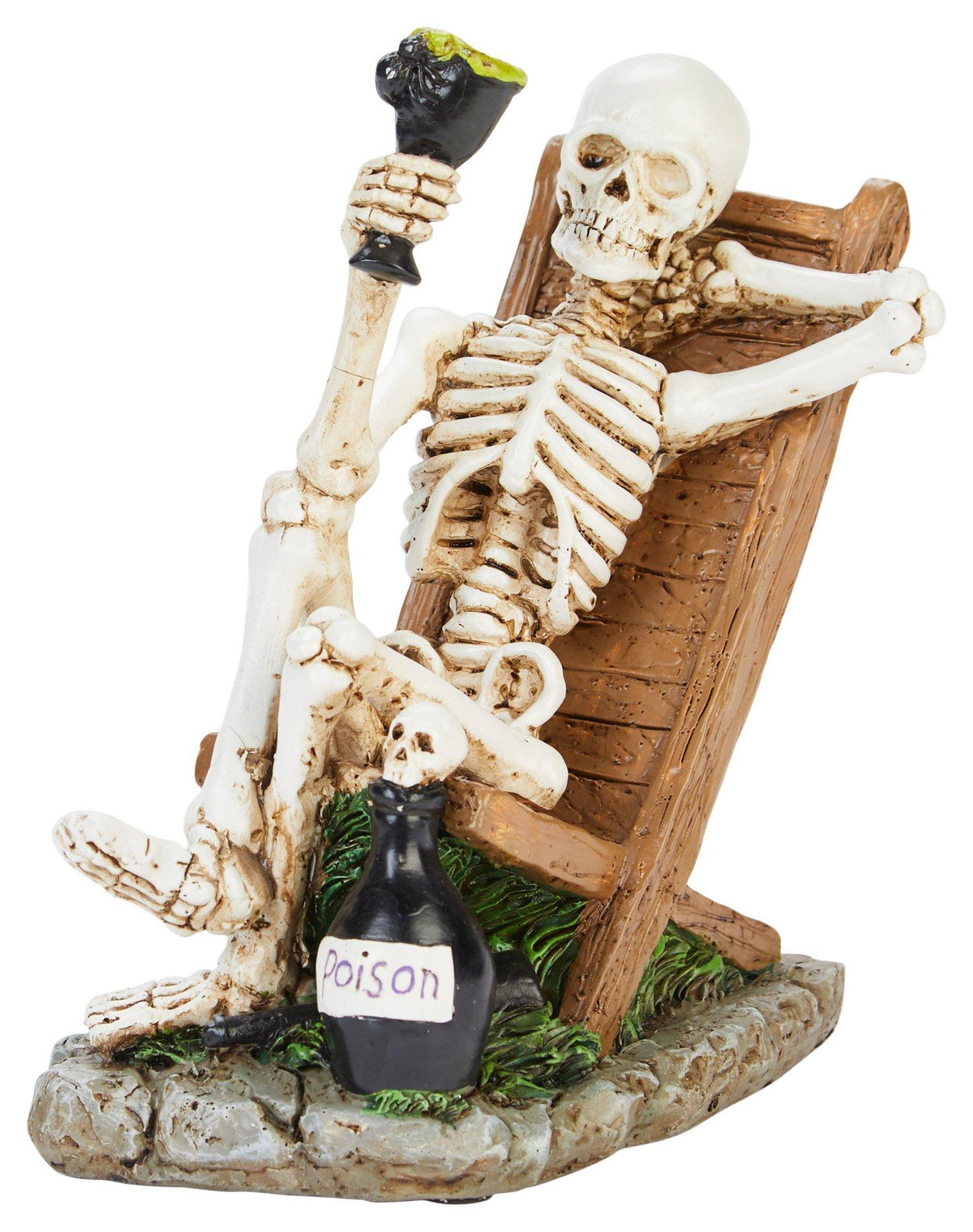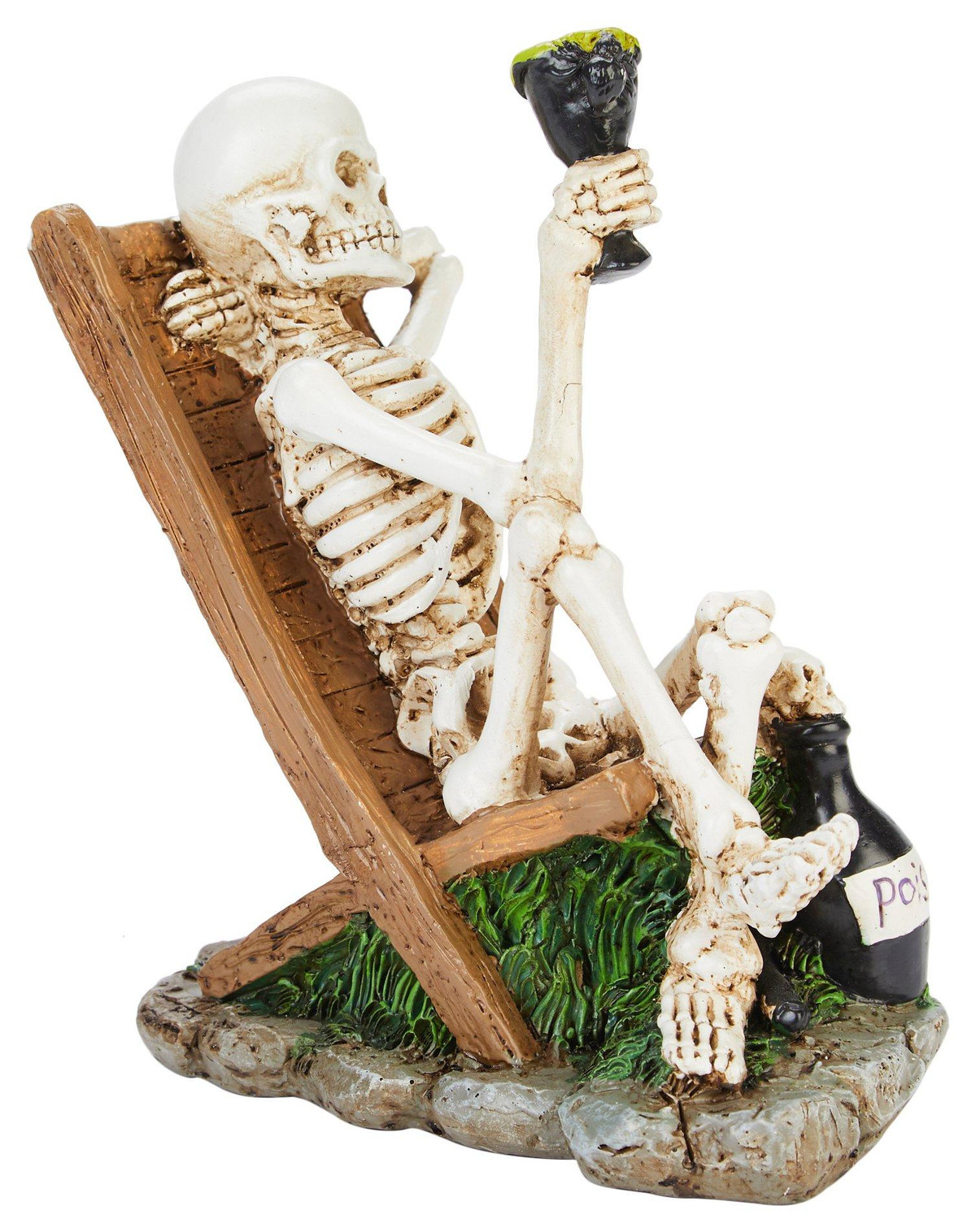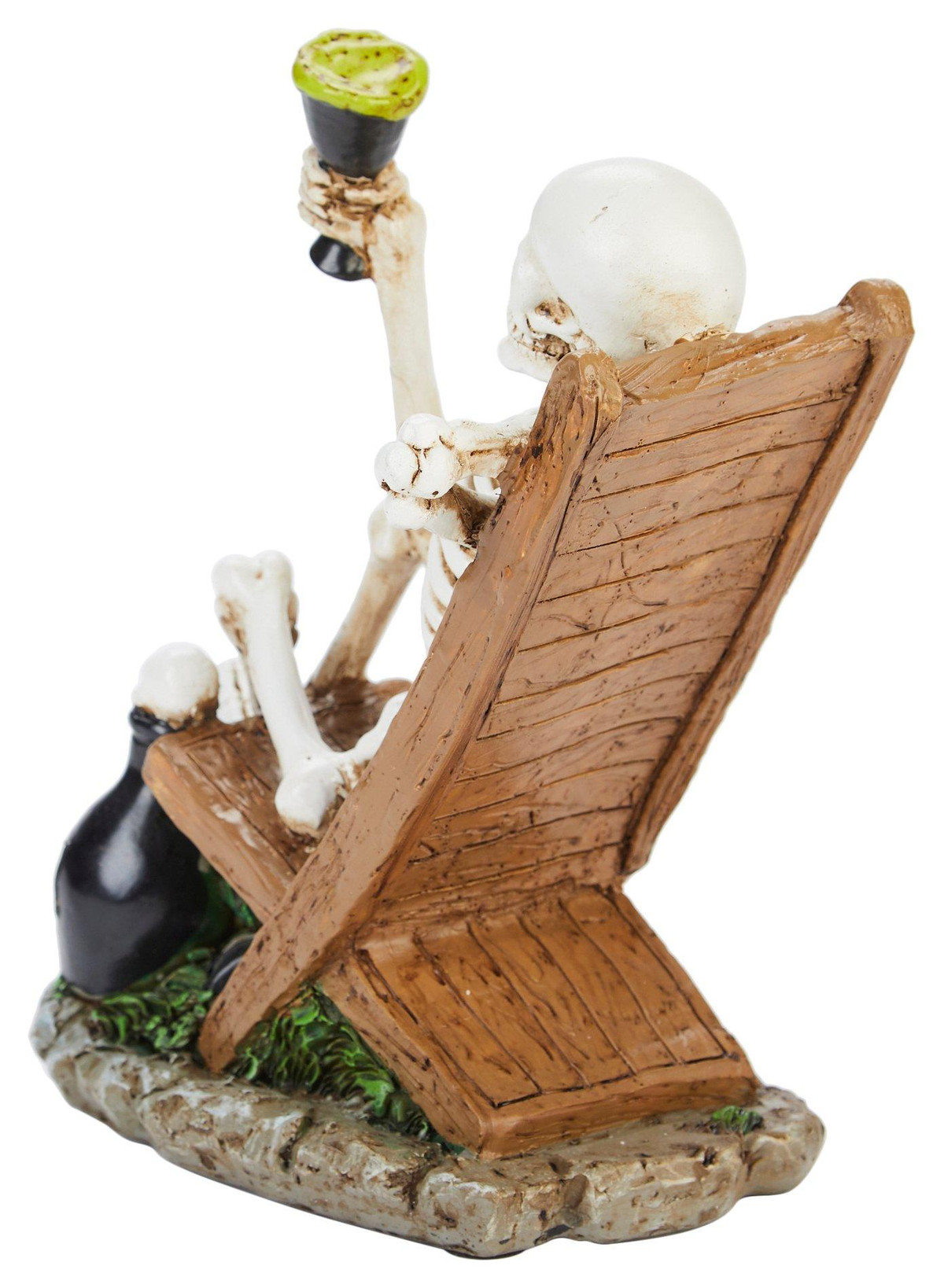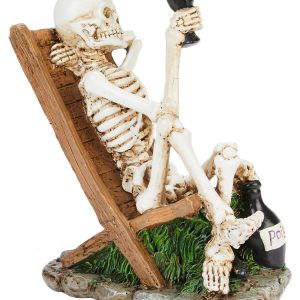 Stretching out at 7.5 in by 4.3 in this resin skeleton knows how to kick back and enjoy the season. With a laid-back pose and a cheeky grin it brings a touch of humor and charm to your Halloween display. Whether perched on a shelf or lounging on your mantel this bony buddy reminds us all to relax and enjoy the spooky vibes.