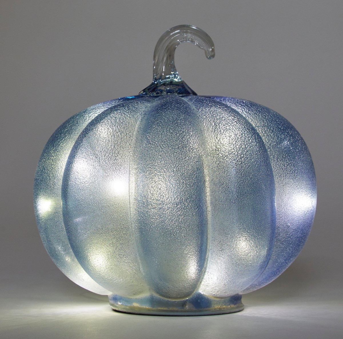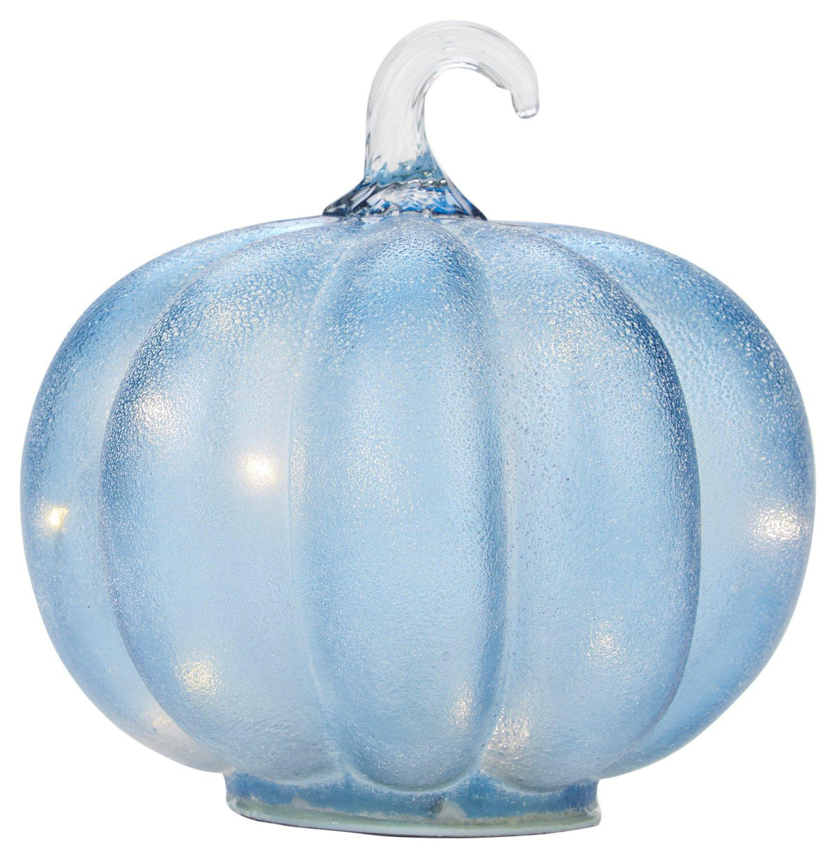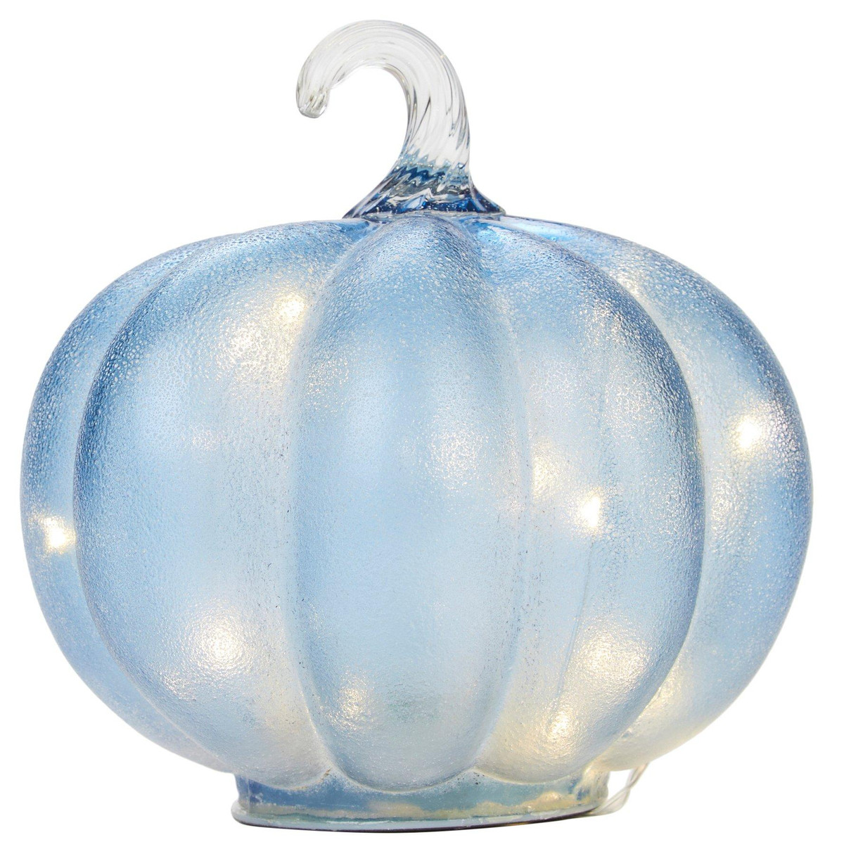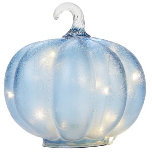 Enhance your autumn décor with this 7 in Blue Glass LED Pumpkin. Crafted from glass, painted a smokey blue, it emits a soft, ambient glow through built-in LED lighting, adding a refined touch to mantels, tables or entryways. A sculpted stem detail completes its elegant silhouette. Ideal for indoor seasonal displays. Wipe clean with a dry cloth.