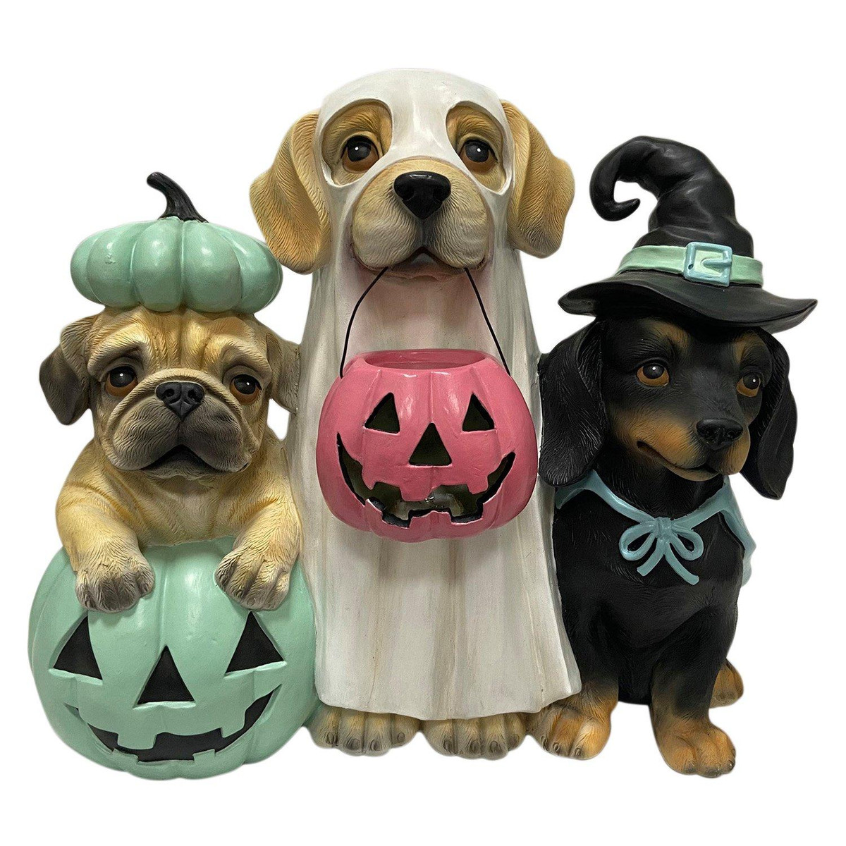Bring a dose of festive fun to your Halloween display with this adorable trio of trick-or-treating pups! Each polyresin dog figurine is dressed in a charming costume. Crafted from durable polyresin and measuring 16.25in. x 10.5in. x 14.375in., this playful lighted decoration makes a paw-sitively perfect statement on any tabletop, entryway, or mantel.