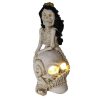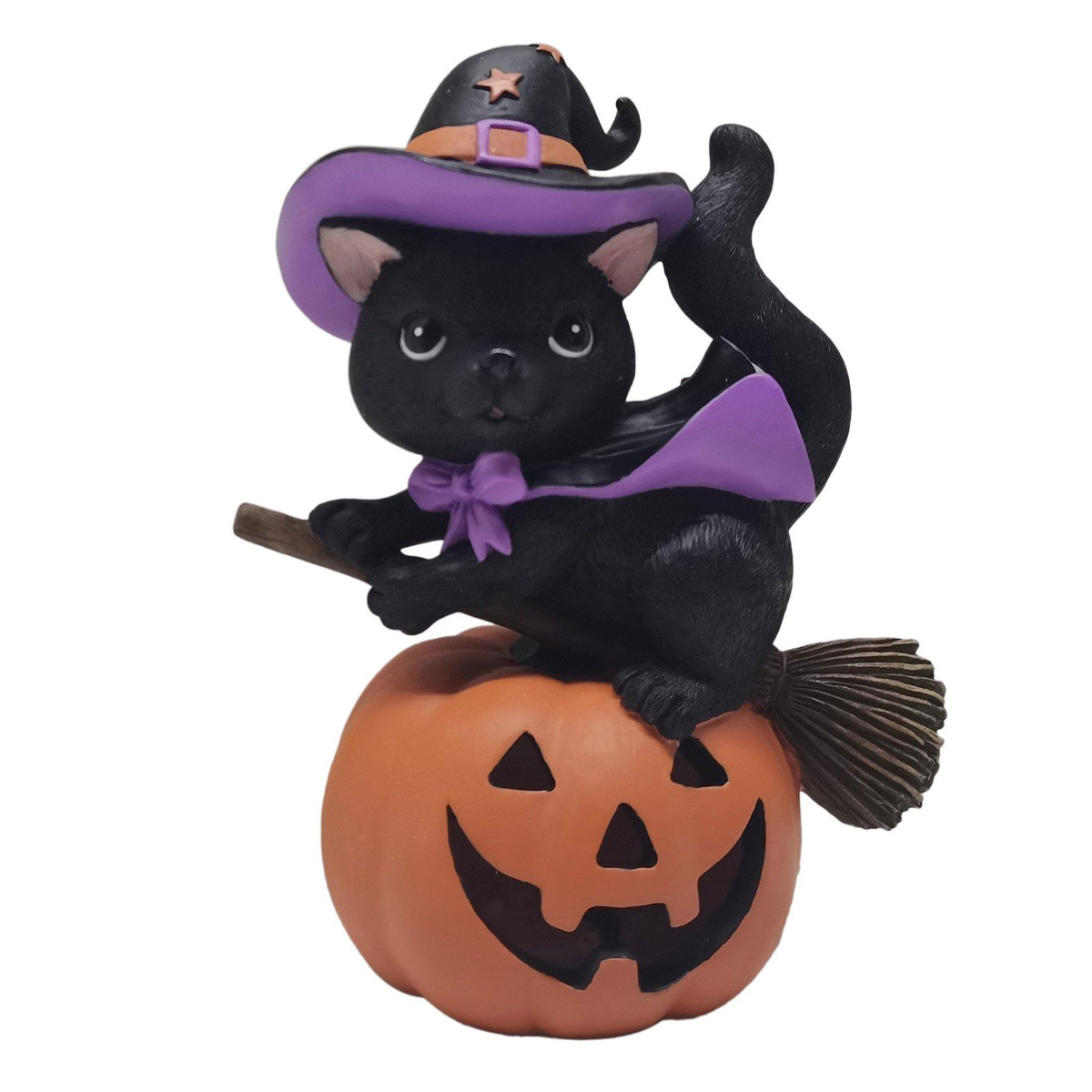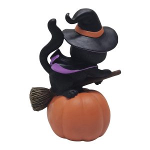 Add a touch of spooky whimsy to your Halloween décor with this charming witch cat figurine. A black cat with a playful expression sits atop a glowing jack-o-lantern, dressed in a classic pointed witch hat and a flowing purple cape. The pumpkin lights up from within, casting a warm, festive glow. Made of durable resin and perfect for indoor displays, this lighted tabletop decoration measures 5.625in. x 3.75in. x 7.5in. a magical addition to mantels, shelves, or entryway tables.