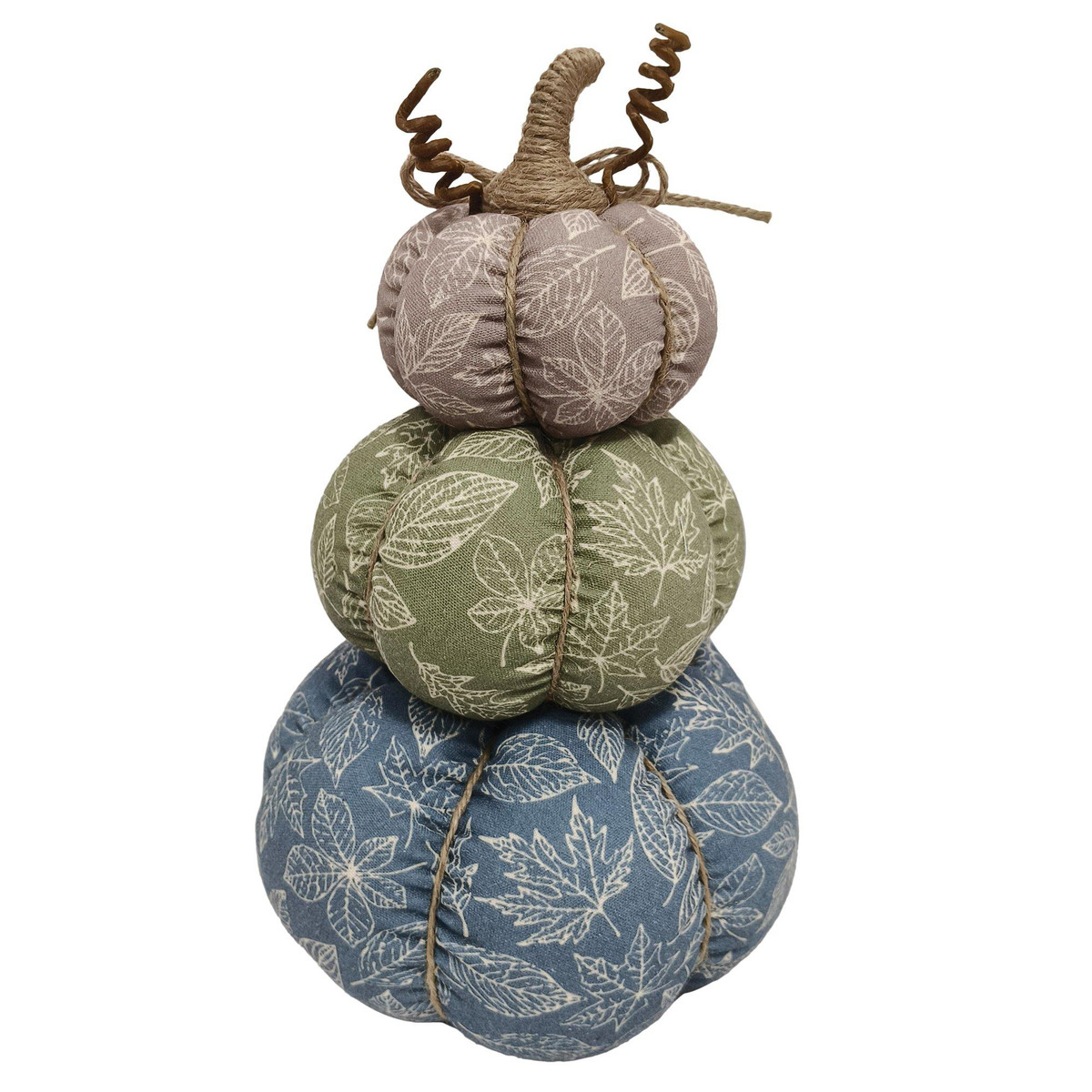 Cozy up your seasonal décor with this charming 13-Inch stacked plush pumpkin ornament. Handmade with care, it features three handmade soft fabric pumpkins in varying sizes and patterns, stacked from largest to smallest for a delightful layered look. Topped with a stem and curled tendrils, this autumn accent adds warmth and texture to any spaceperfect for tabletops, mantels, or cozy corners. Measures 8in. x 8in. x 13in..