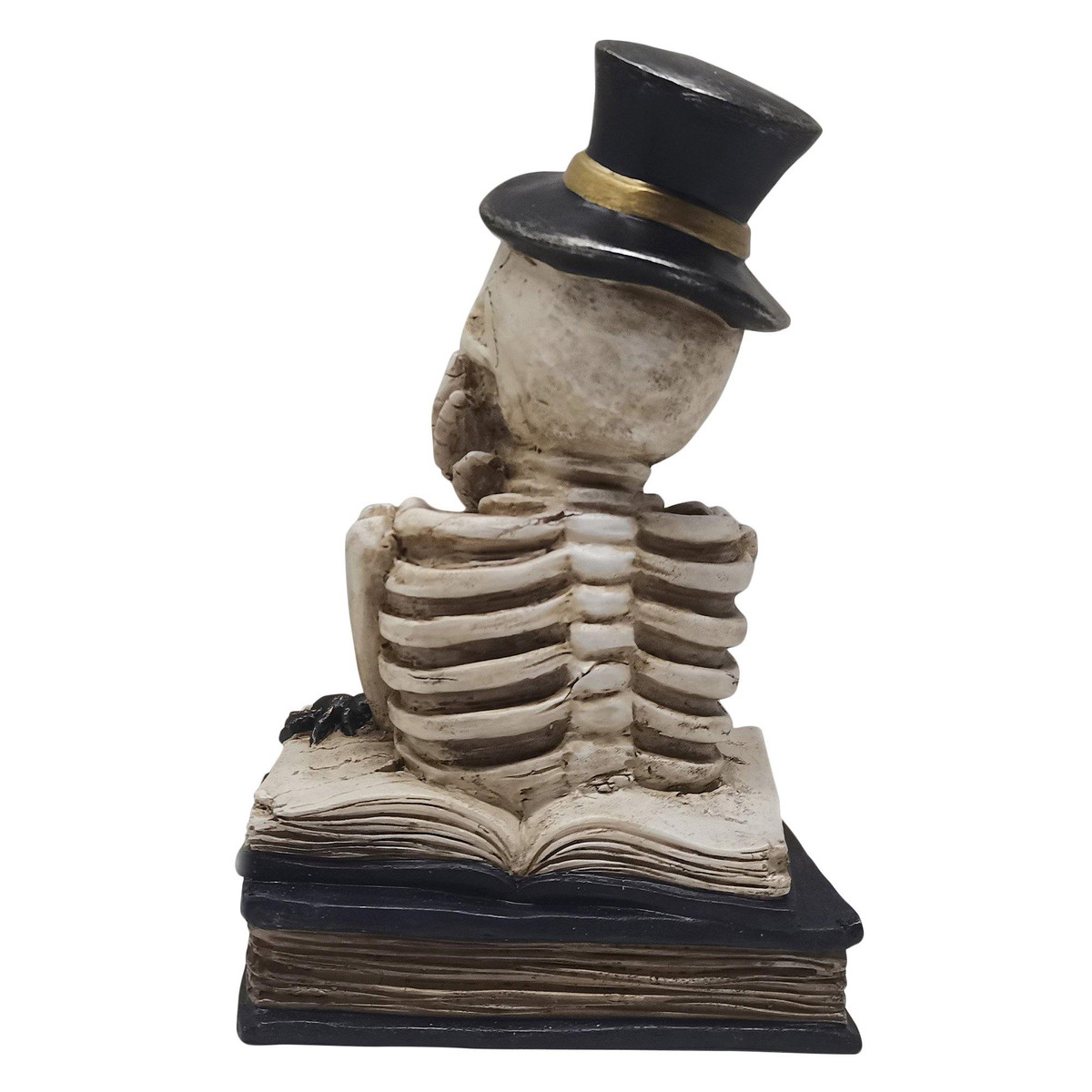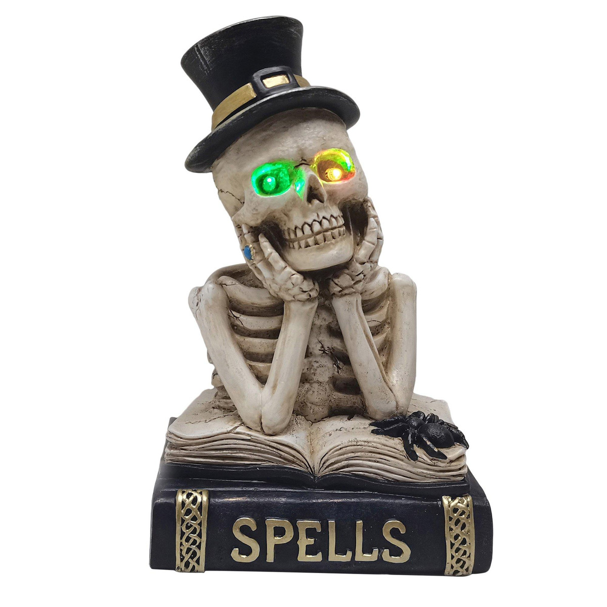 Add a spooky twist to your Halloween setup with this eerie skeleton tabletop decoration. Featuring a detailed skeleton figure posed thoughtfully over an open spell book, this piece brings haunted charm to any room. The skeleton wears a black top hat with a gold band, and its eye sockets flash with multi-color LED lights; green, yellow for an extra spooky effect. Crafted from durable polyresin & measures 6.125 x 4.75 x 9.625 inches & perfect for placing on mantels, shelves, or entry tables.