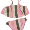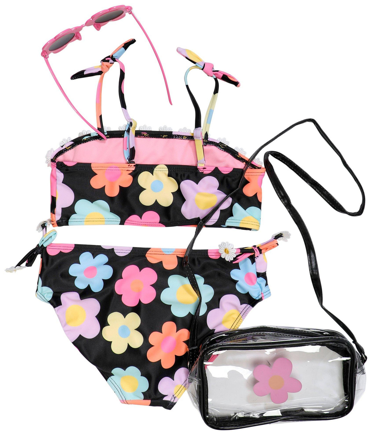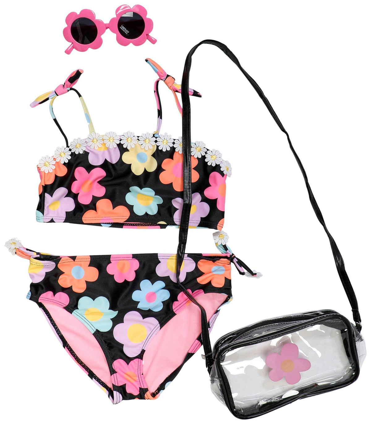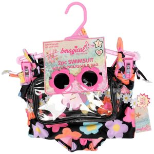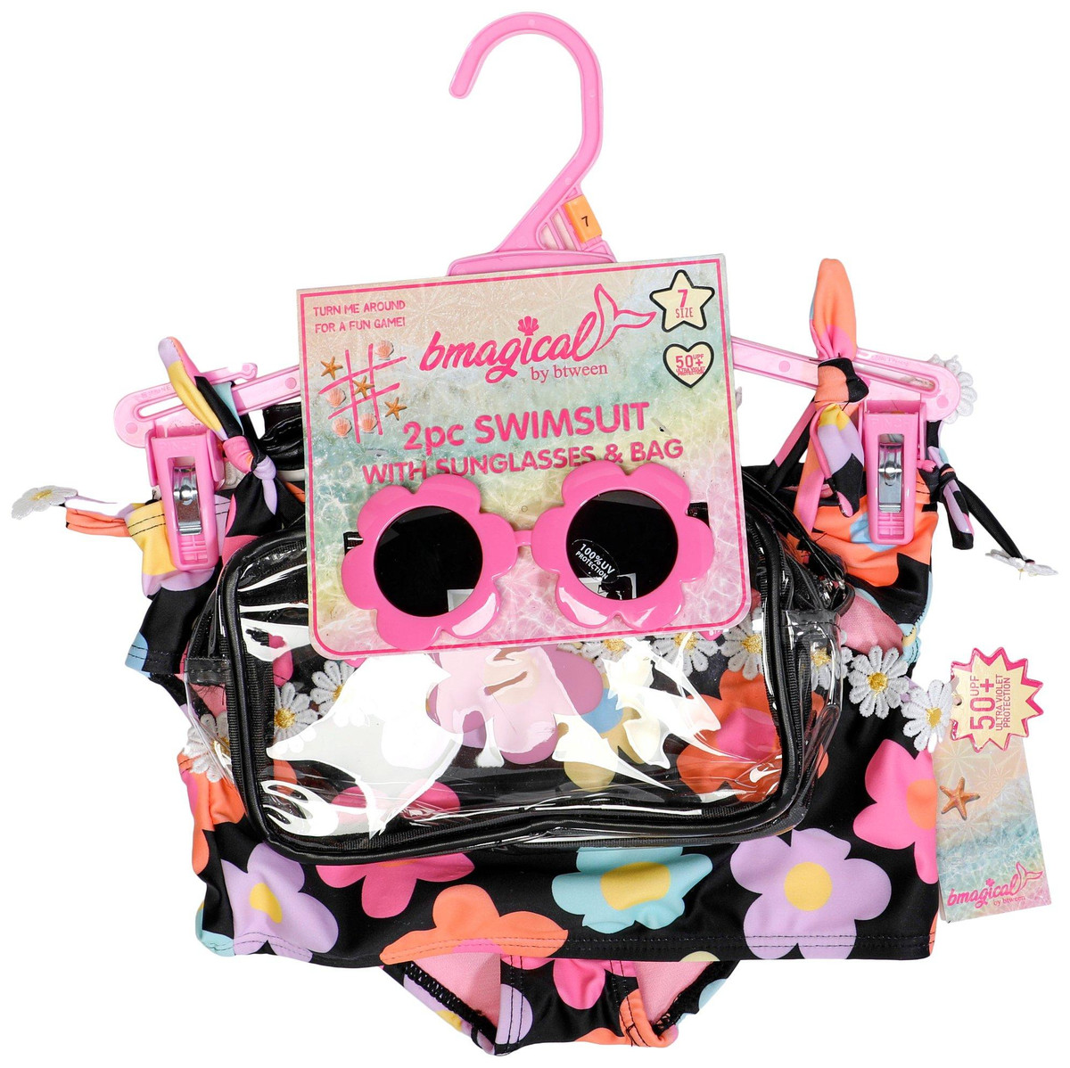 This Btween 2-piece bathing suit features a black floral pattern with UPF 50+ protection for safe fun in the sun. The set is accessorized with stylish sunglasses and a clear bag with black trim, making it perfect for beach or pool days. Designed for comfort and durability, this trendy swim set is a great choice for any little fashionista!