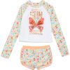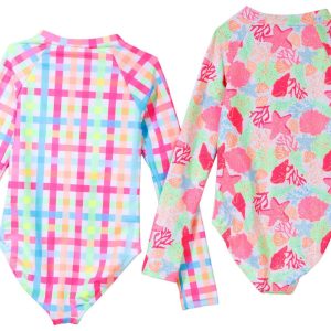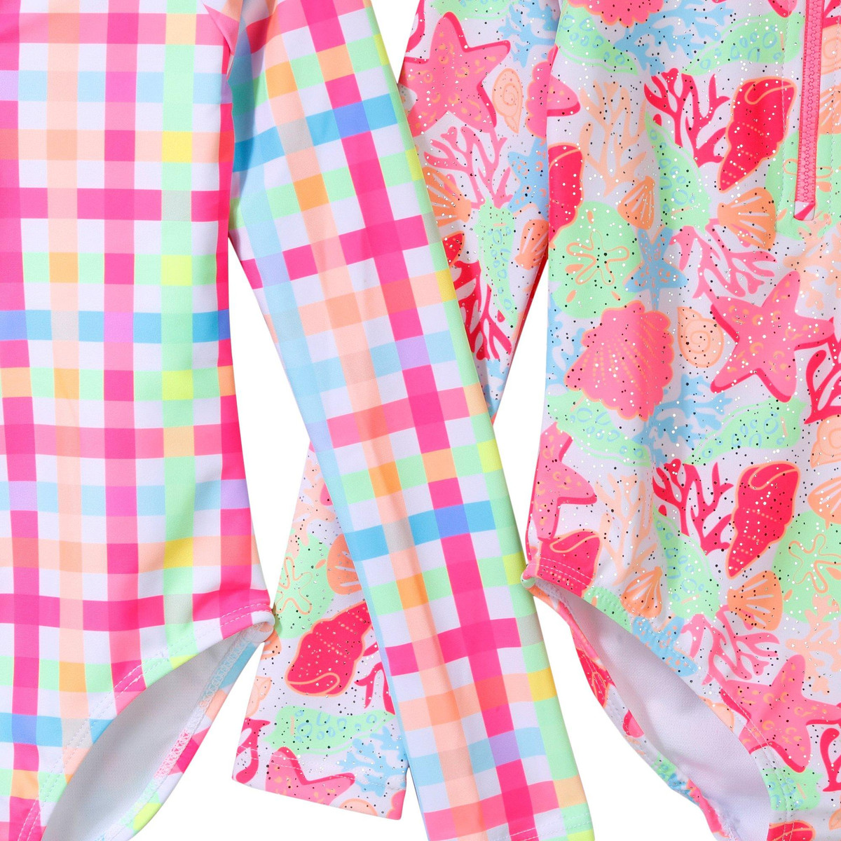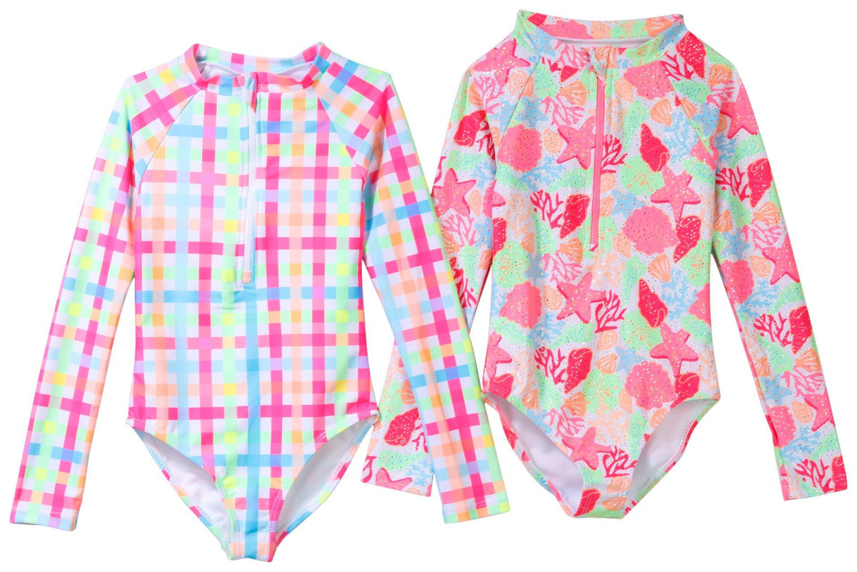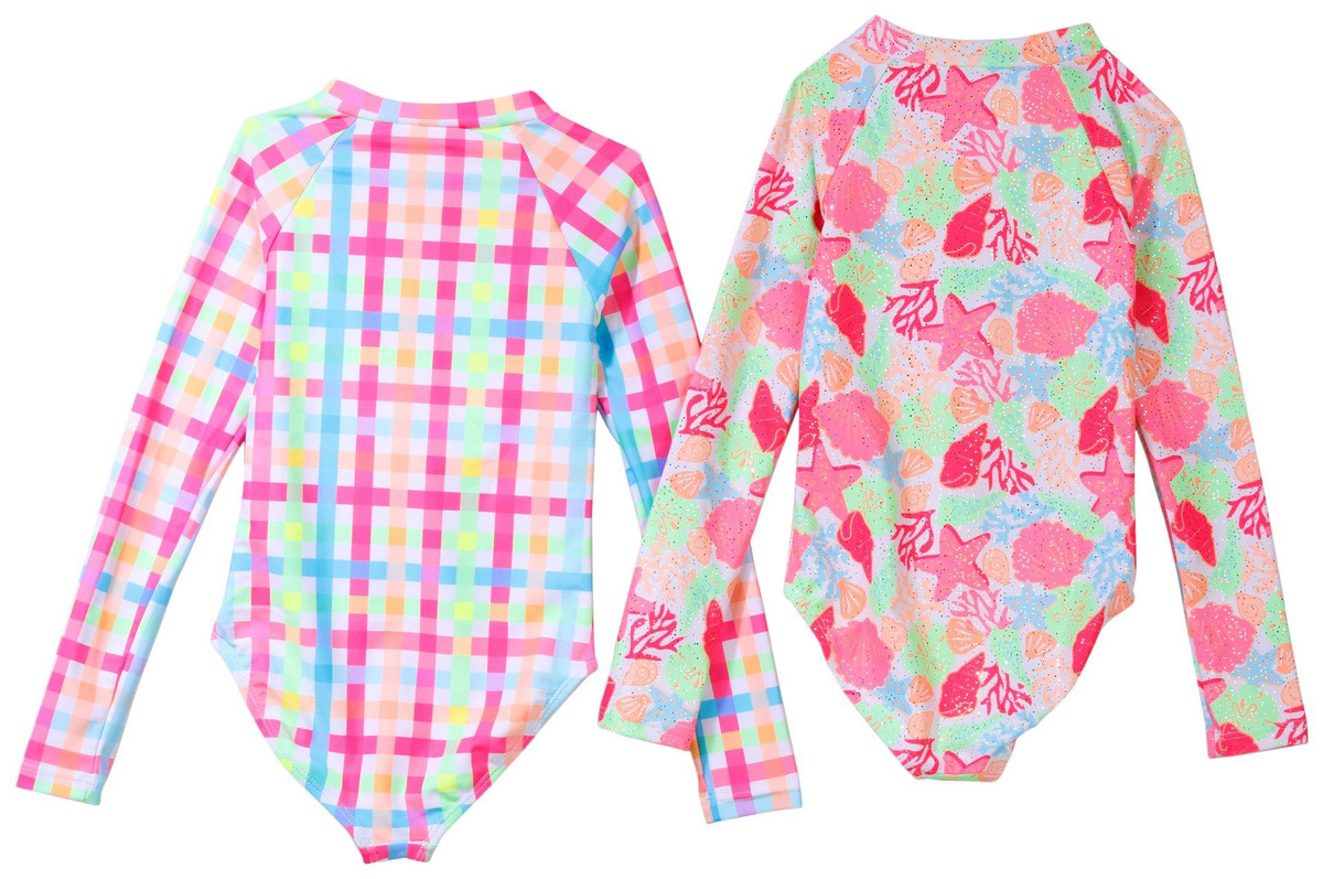 This 2Pk rash guard swimsuits keeps her stylish and protected with UPF 50 coverage. Featuring a front zipper and long sleeves, one has a classic stripe design while the other showcases a sea shell ocean pattern. Perfect for fun in the sun with comfort and easy movement.