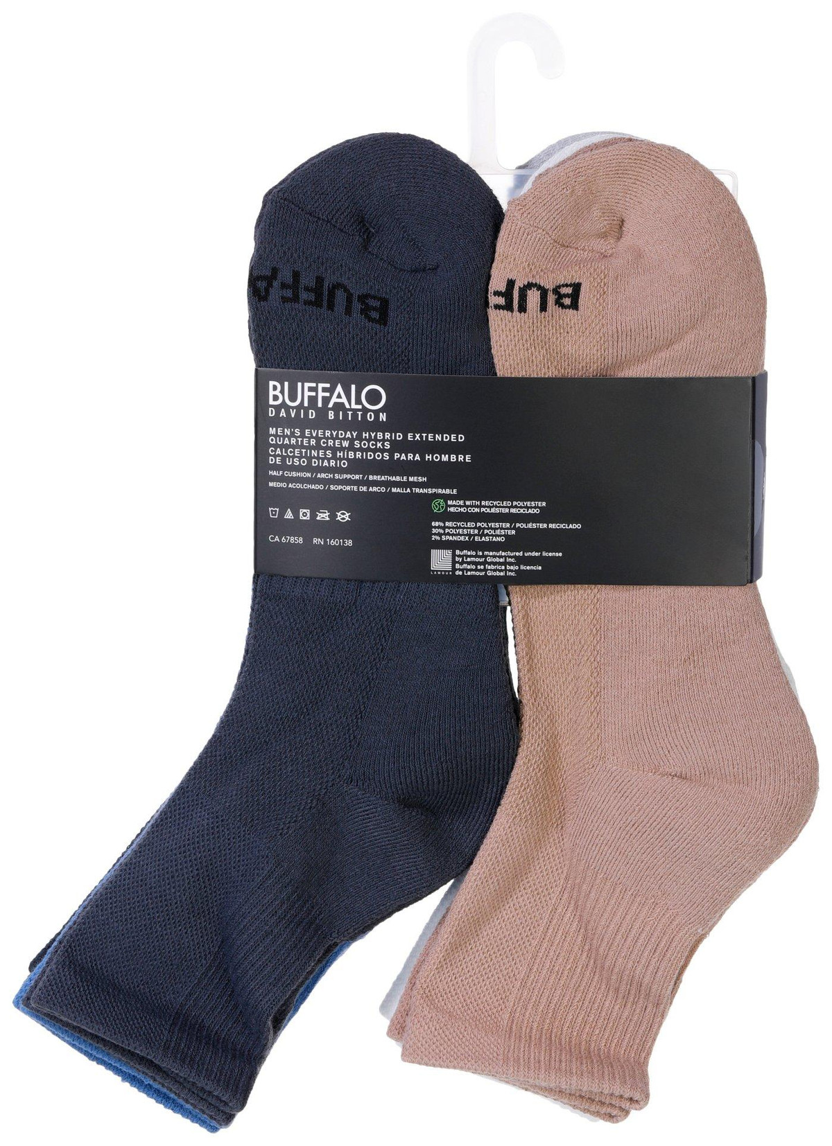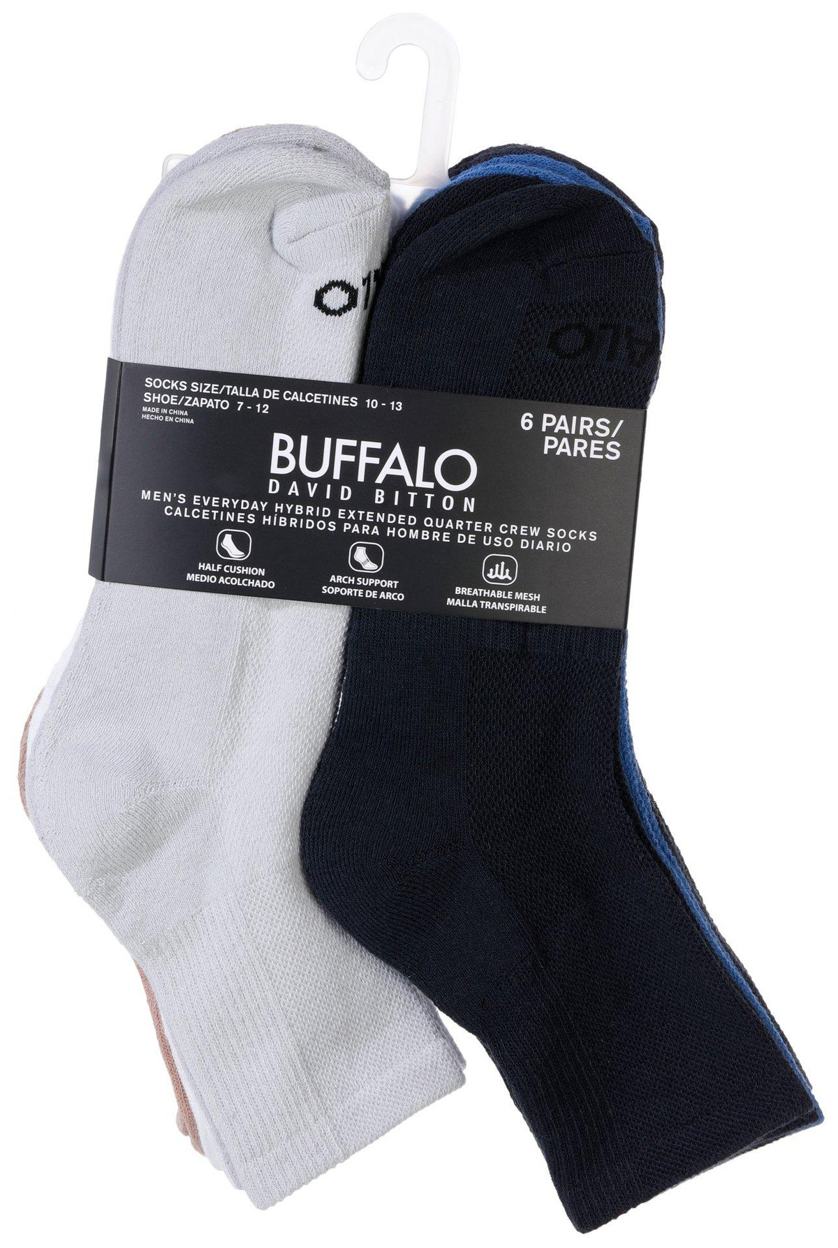 Buffalo David Bitton mens socks come in a 6 pair set designed for everyday wear. These hybrid extended quarter crew socks feature half cushion comfort, arch support, and breathable mesh for all day performance. Made with recycled polyester in assorted colors, they combine style and sustainability. Grab your set now and upgrade your essentials.