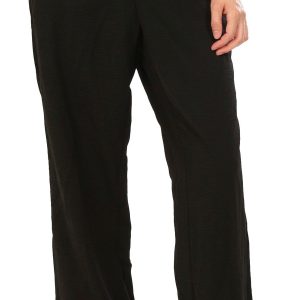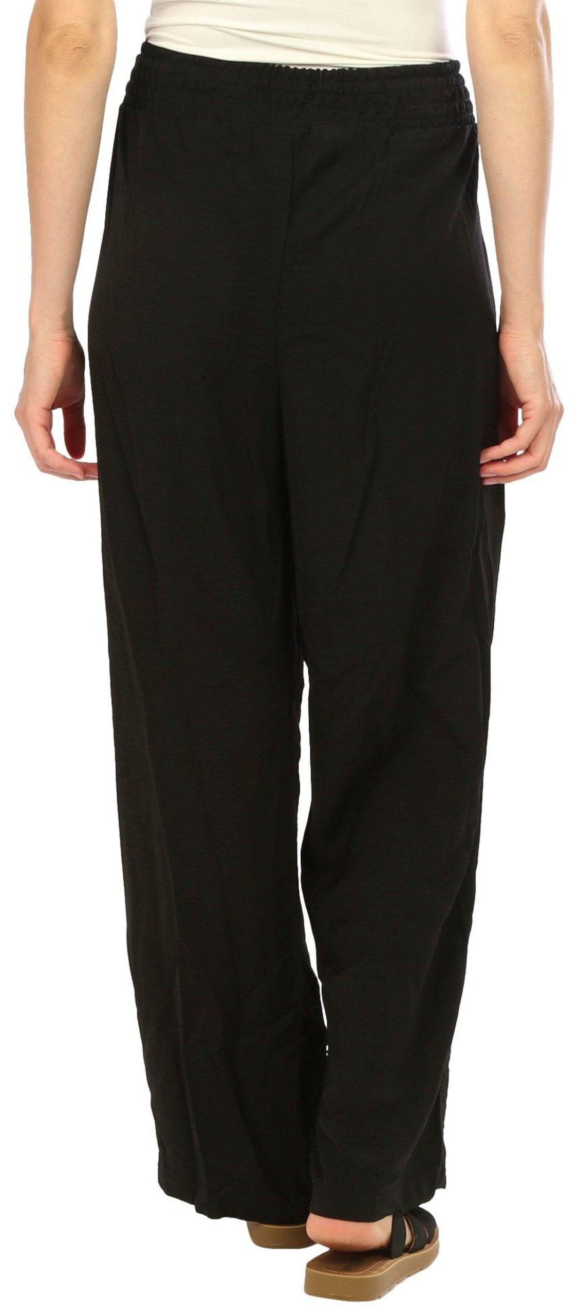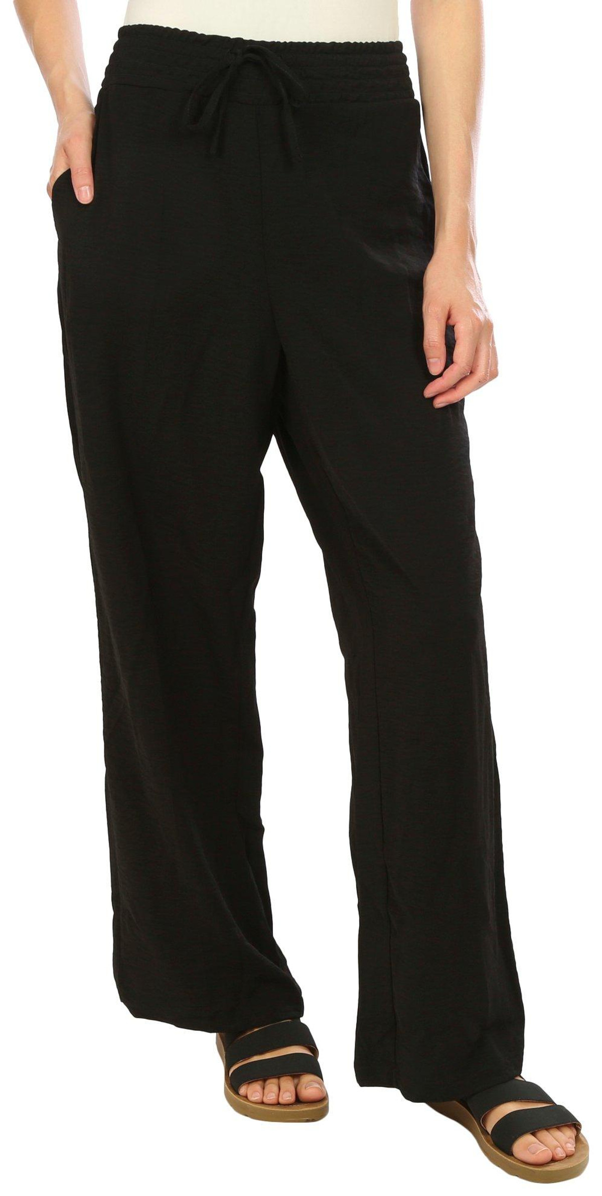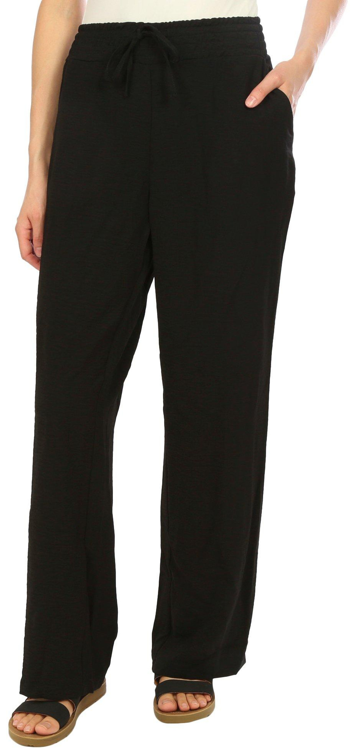 These wide leg pants feature a solid-color design on lightweight fabric, elastic drawstring waistband, and wide leg styling. The length is 30 in. Fabrication is 100% polyester.
