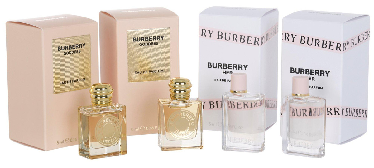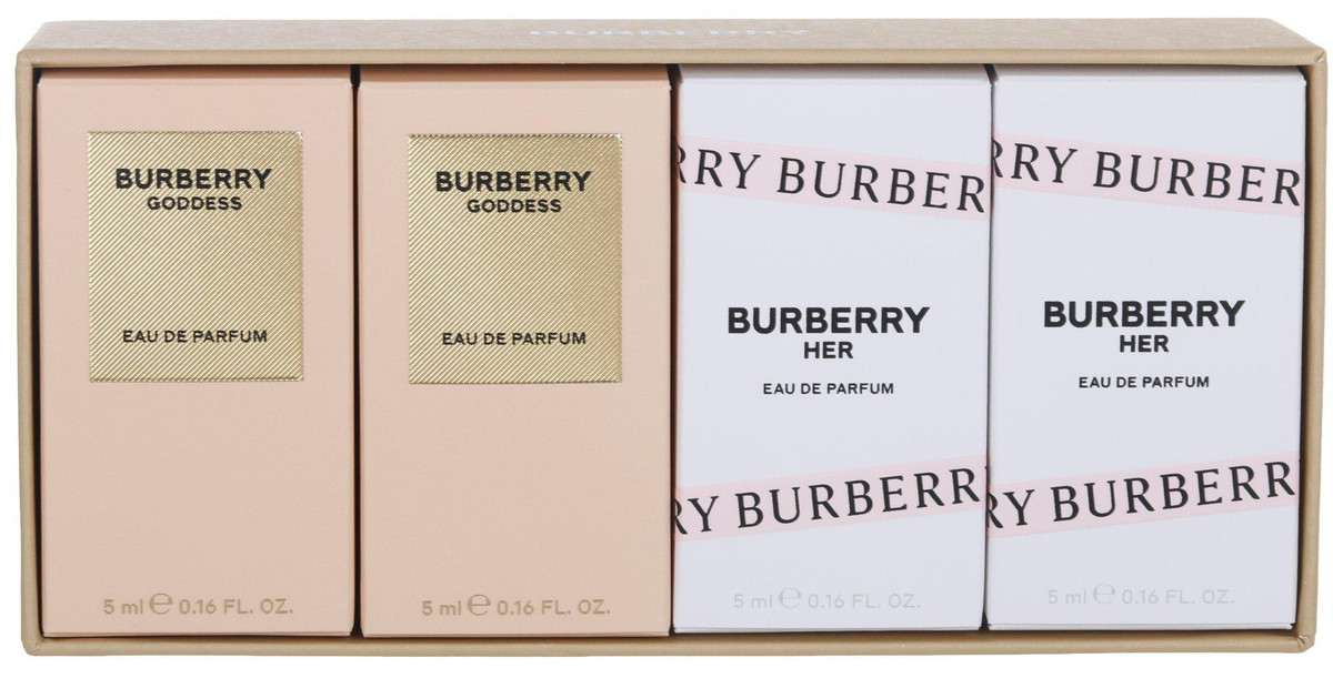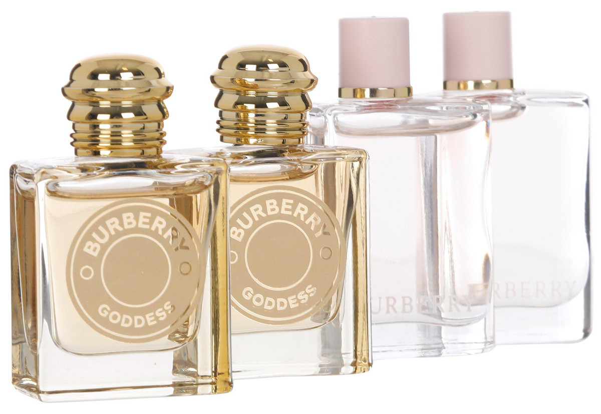 Indulge in luxury with the Burberry Fragrance Gift Set. This 4-piece collection includes 2 Goddess Eau de Parfum + 2 Her Eau de Parfum each in a convenient 0.16 FL. Oz. size. Perfect for gifting or treating yourself.