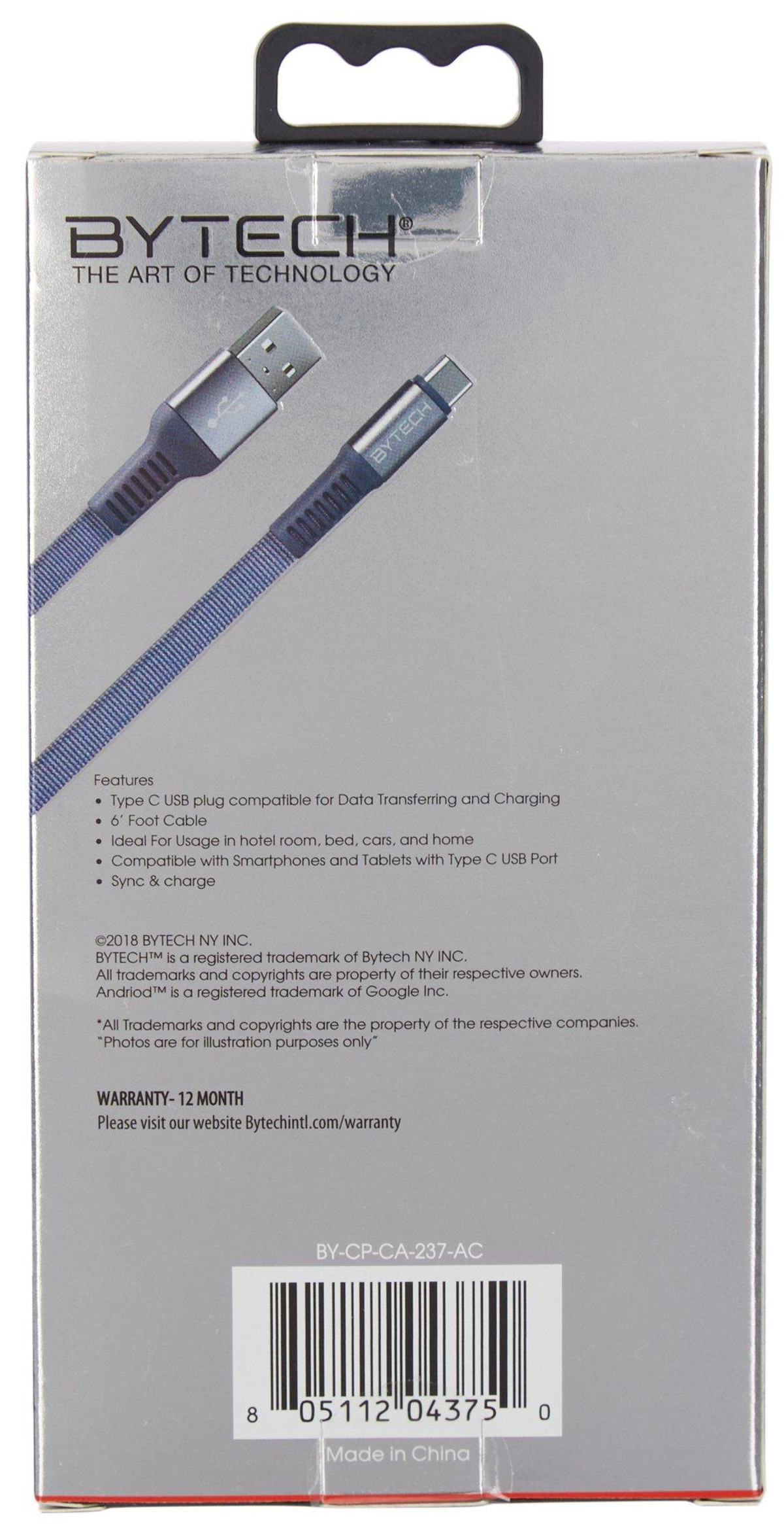 Bytech looks to seamlessly access the world of technology in a clean, lightweight and stylized way. This type C cable features a compatible USB plug for data transferring and charging, ideal for usage in a hotel room, bed, cars, and home, sync and charge. The cable measures 6ft L.