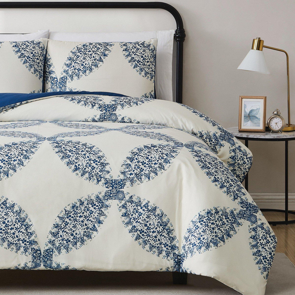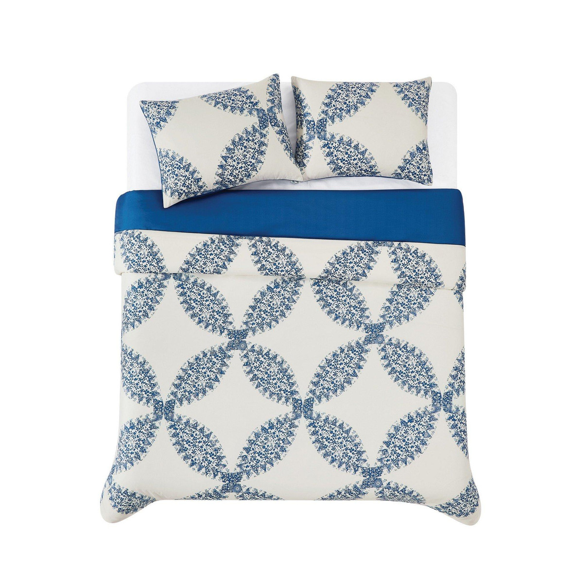 The Abigail bedding set by Cannon. Face and Pack Fabric are 100% brushed microfiber polyester in a percale weave with a printed pattern with a weight of 85 GSM with a 200 GSM 100% polyester filling. This item is manufactured and imported from China. Includes: 1 Comforter and 2 Shams (1 for Twin/Twin XL).