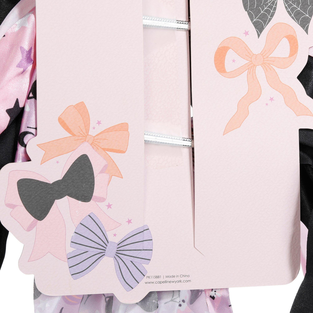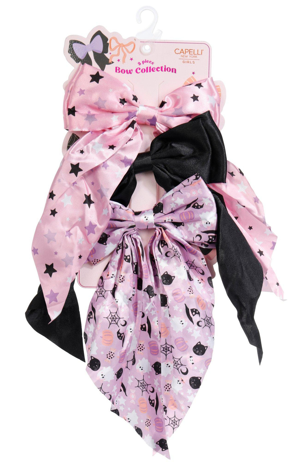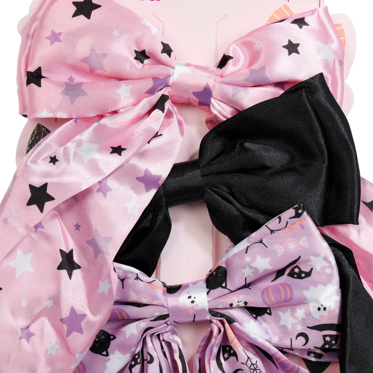 Add festive flair to hairstyles with this 3 pc Halloween Hair Bow Set, featuring one pink bow with stars, one solid black, and one printed with ghosts, witches hats, black cats, and pumpkins. Made from shiny satin material and secured on metal clips for easy styling. Perfect for costumes, parties, or seasonal wear.