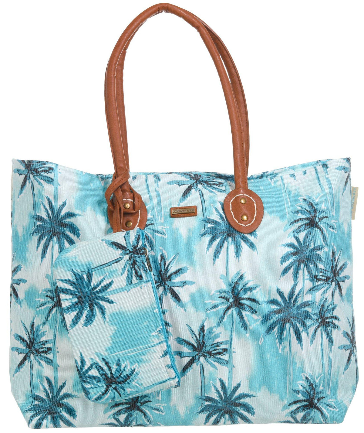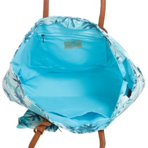Keep all of your essentials safe and organized on your next beach adventure with this colorful print handbag! It features a colorful palm tree print pattern, double handles, zipped main opening, interior slip pockets, and a bonus wristlet. Measures approximately 7 in x 12 in x 16 in.