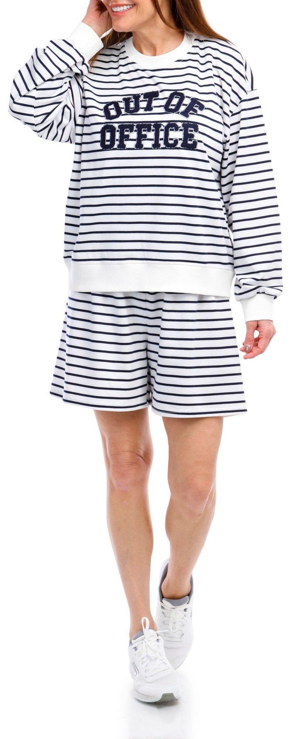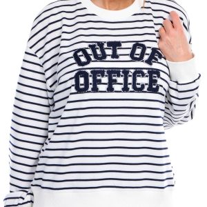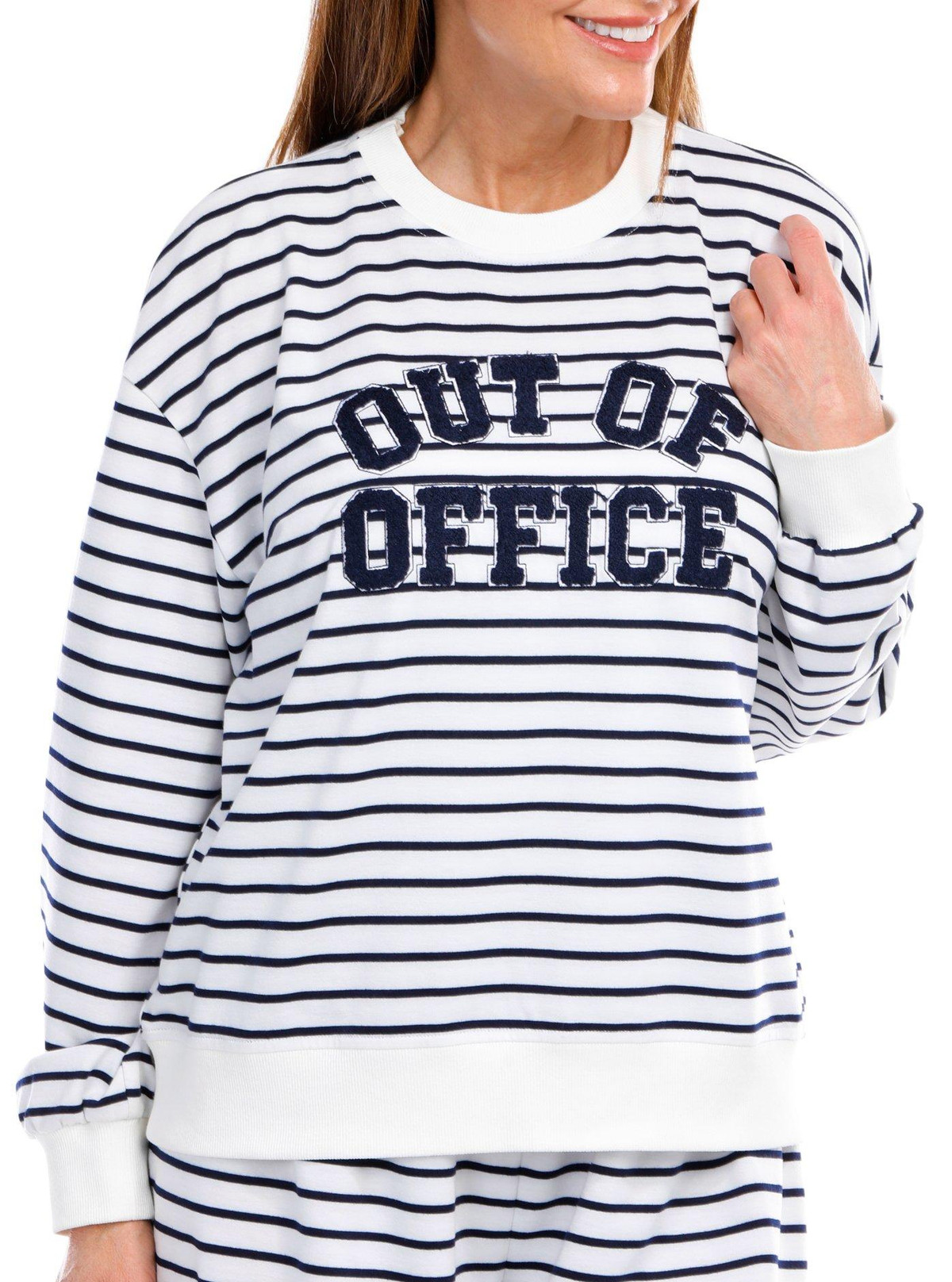Stay cozy and stylish with this Long Sleeve Sweatshirt. Featuring a textured Out of Office motif and a chic striped print, this sweatshirt adds a playful touch to your casual wardrobe. The classic crew neck design ensures a comfortable fit, perfect for relaxed days or casual outings. Embrace the laid-back vibes and effortless style with this unique and comfortable piece. Enjoy the perfect blend of fashion and comfort with this standout sweatshirt. Fabrication is 95% polyester, 5% spandex.