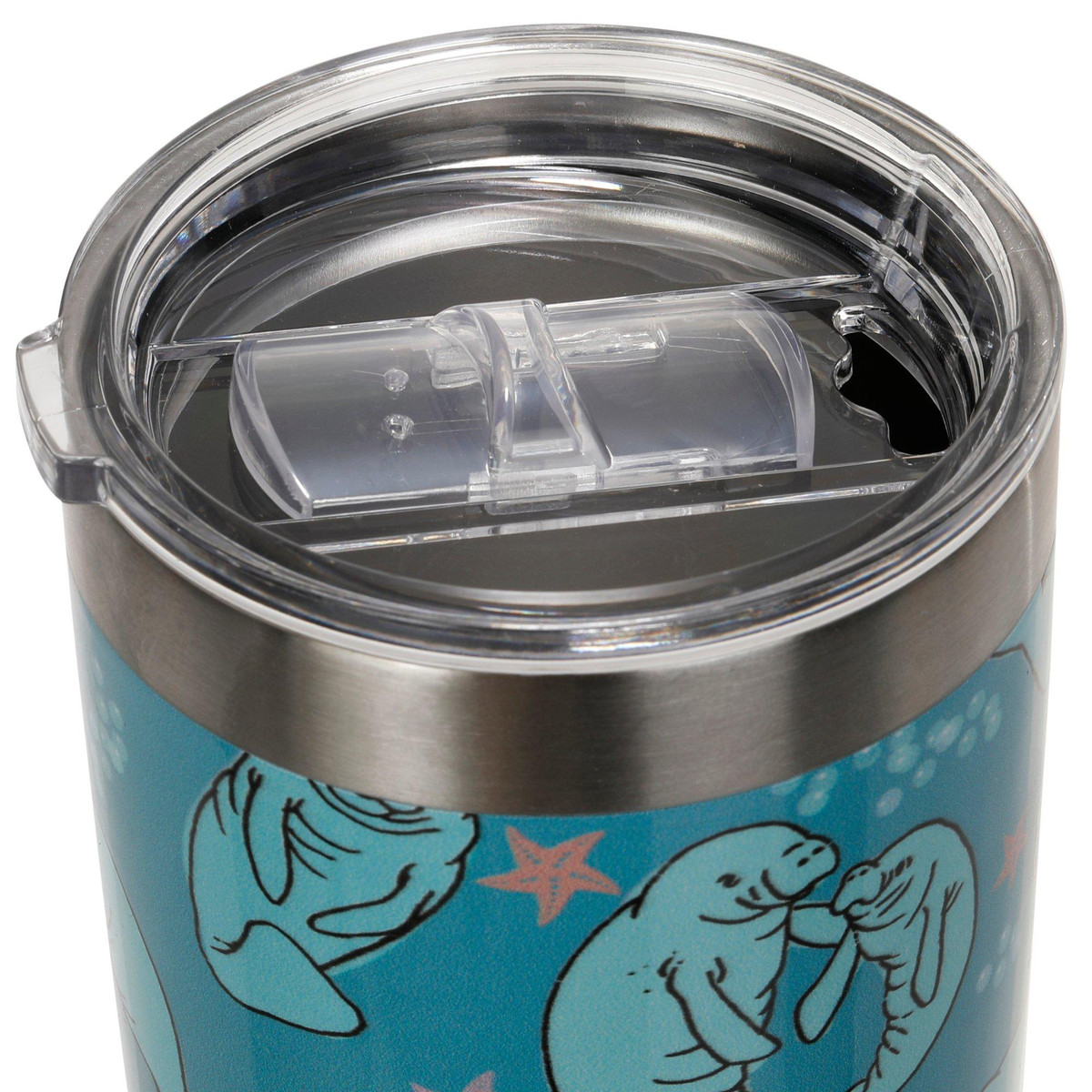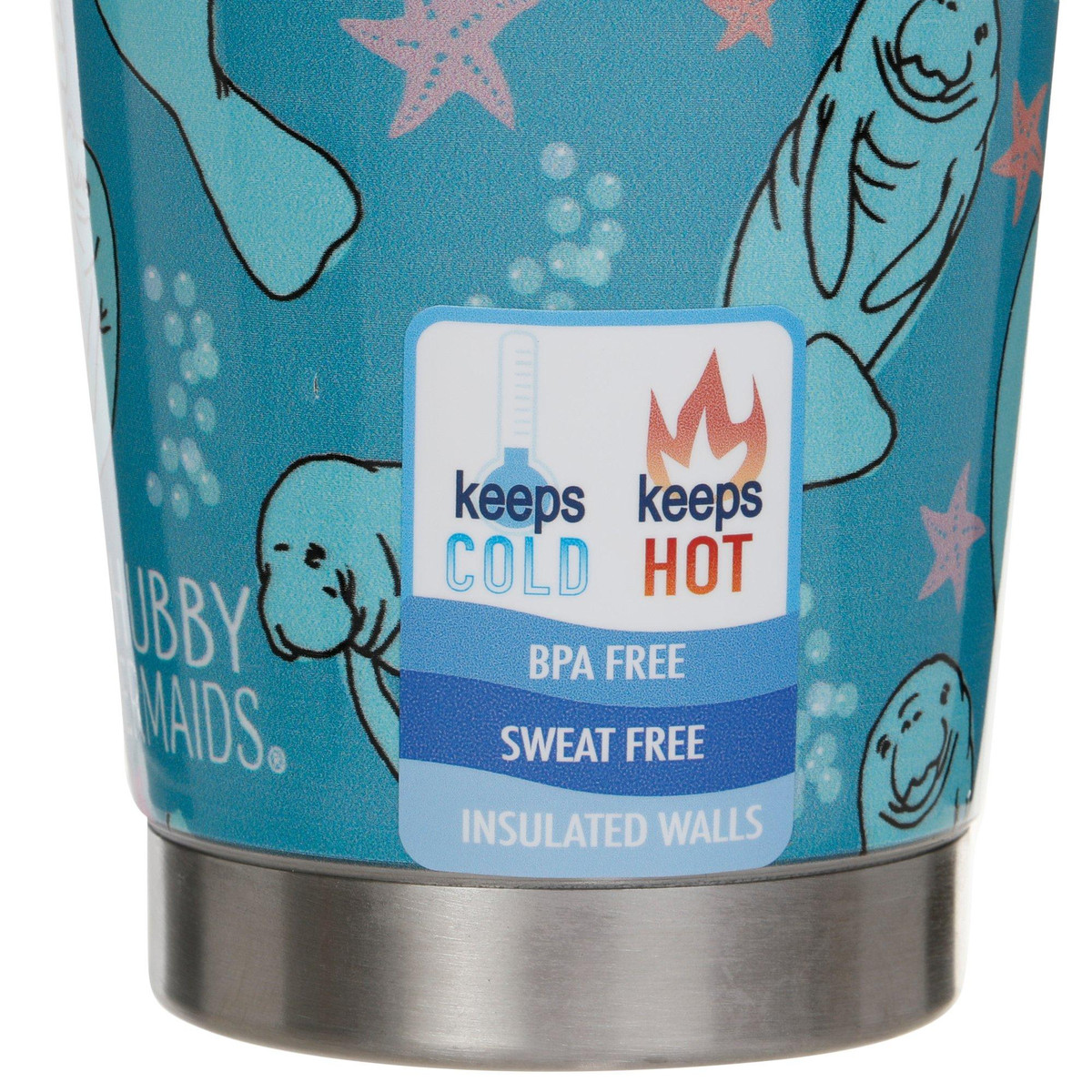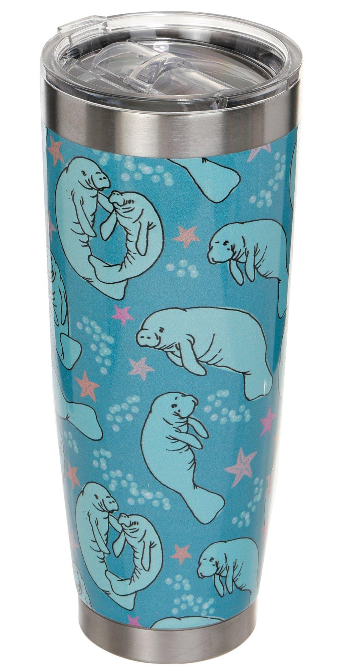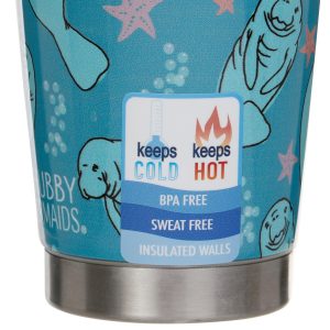 This vibrant Chubby Mermaid Manatoss cup is durable and reliable with a splash of artwork that makes it stylish as well. This travel tumbler keeps drinks hot or cold longer and reduces condensation. Spill-proof lid included. This cup is BPA free and can hold 30 oz.