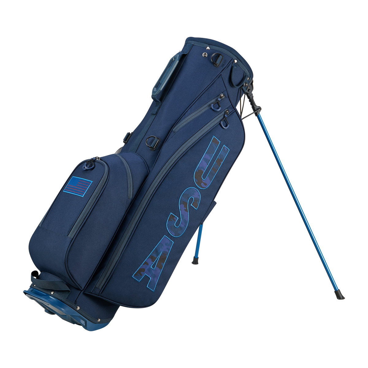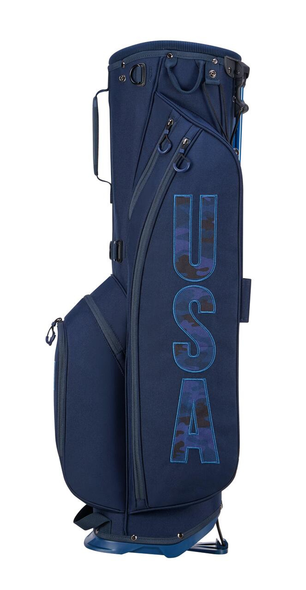 This USA Golf Bag is the perfect intersection of comfort & versatility. Features 8in 4-way top with molded handle, providing easy maneuverability on the course.Quick-action stand system.TPR grab handle and lower trunk handle.6 Pockets:1 large side pocket, 1 velour-lined valuable pocket, 1 large zip-off ball pocket, 1 small accessory pocket, 1 large side pocket, and 1 large open cooler pocket.Comfortable Multi-strap carry with Self Balancing Tech. Fixed Towel, Glove and Umbrella Attachments.