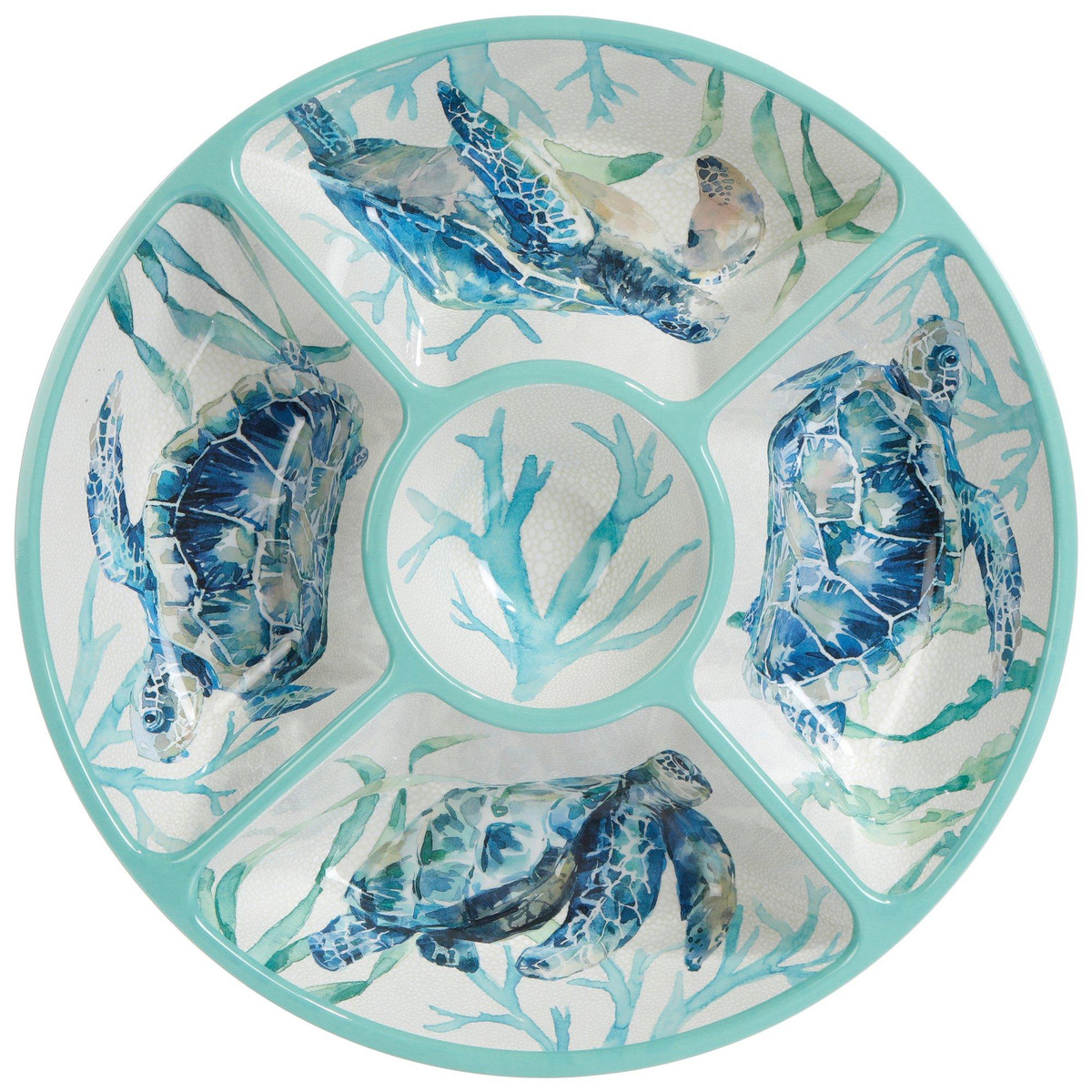 Serve in style with this 15 inch melamine divided serving bowl, designed with a sea turtle design in soothing ocean tones. Perfect for appetizers, chip and dip, or small bites, it adds a touch of seaside elegance to casual meals, picnics or outdoor entertaining. Fabrication is 100% melamine. Measures approximately 15 in round x 2.5 in.