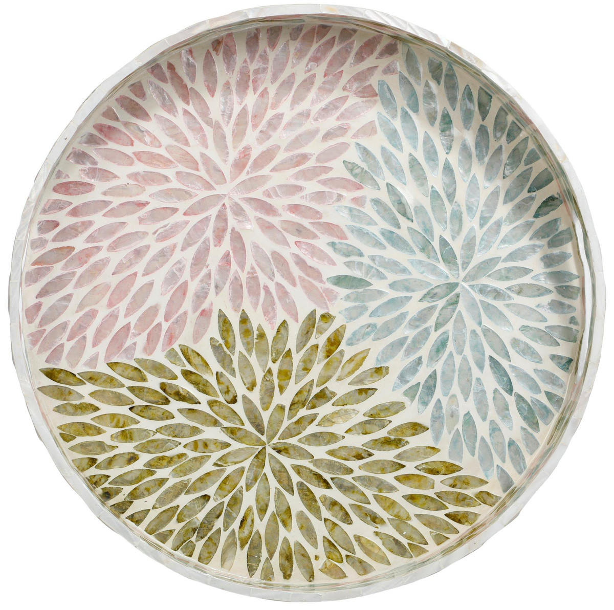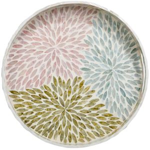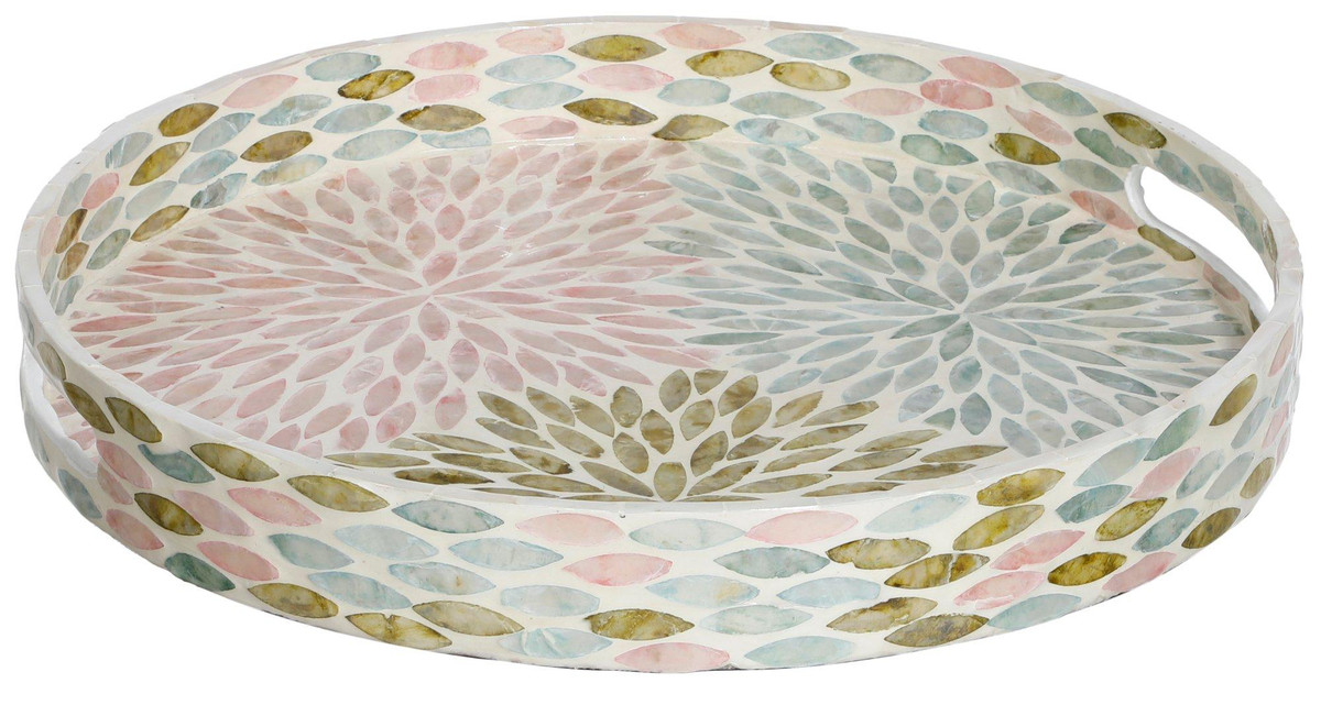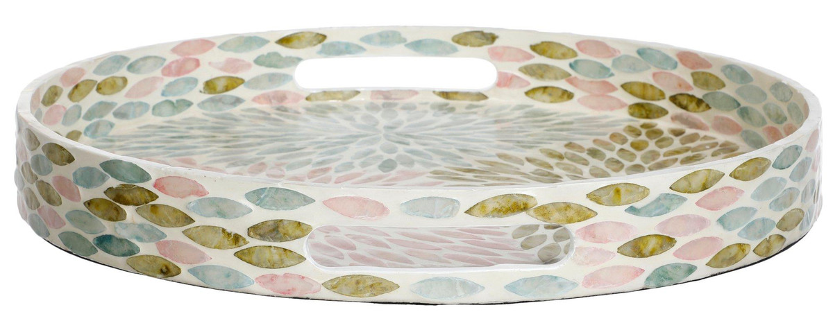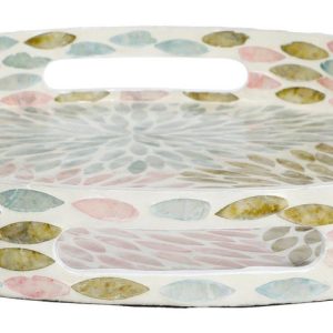 Introducing this eye-catching Round Capiz Tray, a captivating piece that combines elegance and functionality. This tray is crafted from exquisite colorful capiz shells, offering a shimmering finish that enhances any decor. It is perfect for serving drinks, displaying decorative items, or organizing essentials. Its round shape and vibrant color make it a standout addition to your home, adding a touch of sophistication and coastal charm to any room. Measures 16 in.