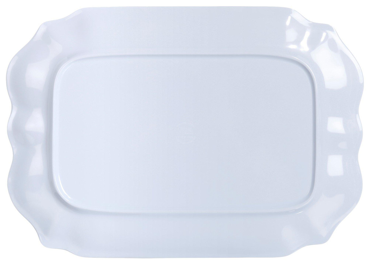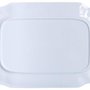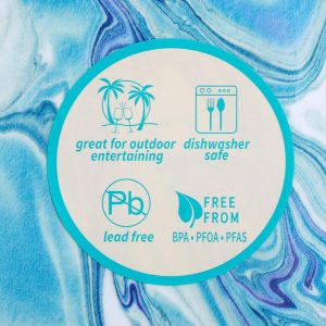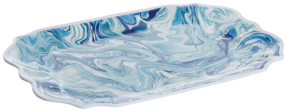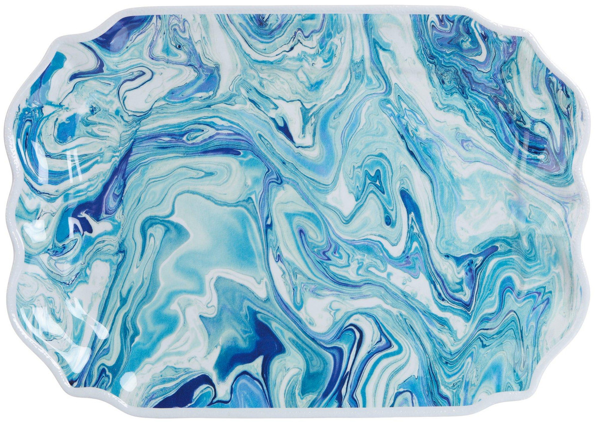 Elevate your table with this 19 inch melamine serving platter, featuring a coastal inspired marble design using ocean colors and a raised floral edge. Durable yet stylish, its perfect for serving everything from appetizers to main courses. Ideal for both everyday meals and outdoor gatherings with a seaside flair. Fabrication is 100% melamine. Measures approximately 19 in x 11 13.5in.