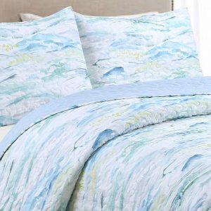 Coastal Home adds a touch of coastal style to your home entertaining, decoration & dining. This quilt set features a stylish striped design and includes one quilt and two pillow shams. Fabrication is 100% Polyester. Filling fabrication is 70% Cotton, 19% Polyester, and 11% rayon.