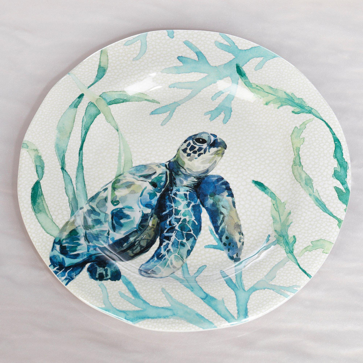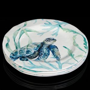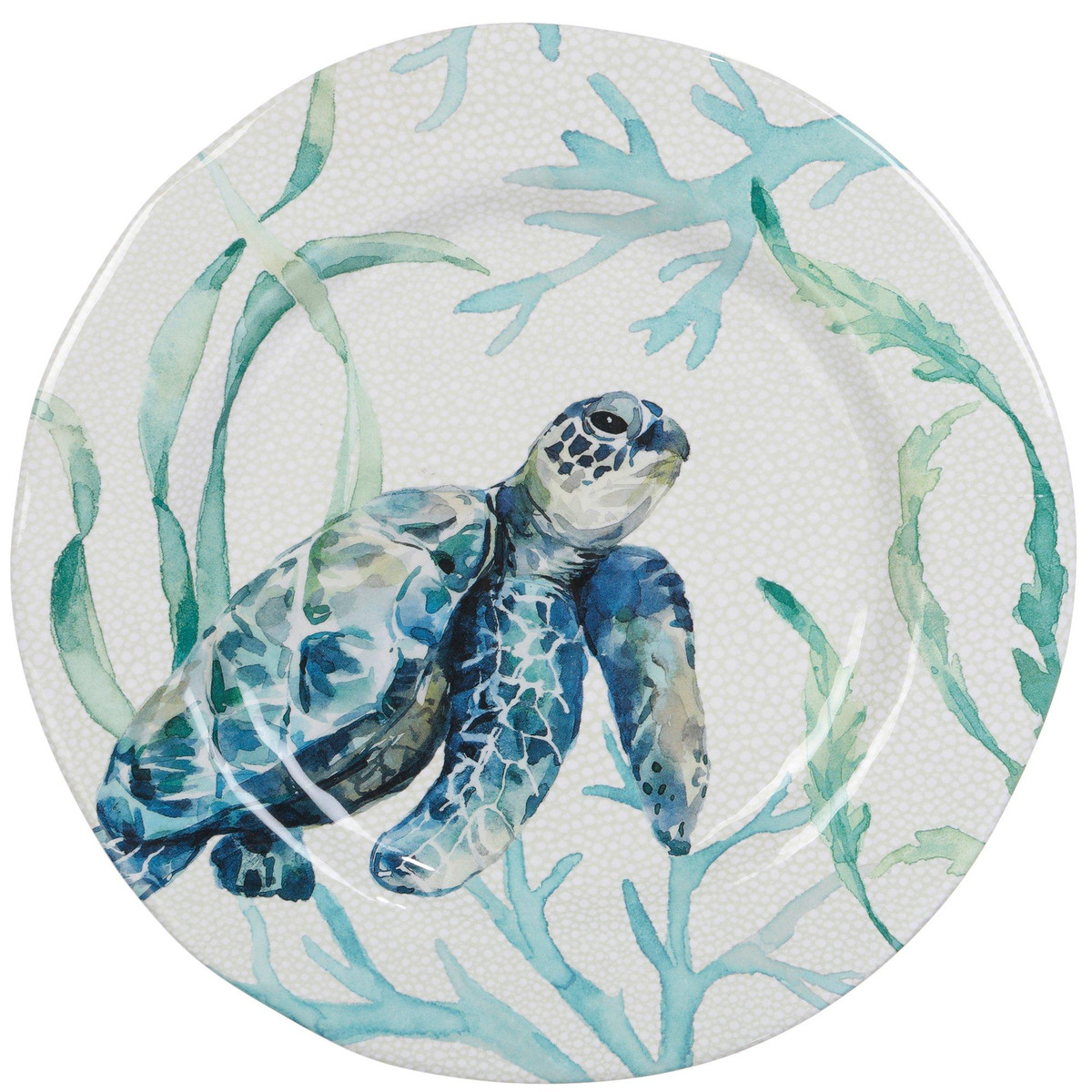 Add coastal charm to your table with this 4 pack of round melamine salad plates, featuring an ocean-inspired sea turtle design. Durable and lightweight, they blend everyday functionality with seaside elegance, making them ideal for small meals, salads or outdoor entertaining. Fabrication is 100% melamine. Measures approximately 9 in round.