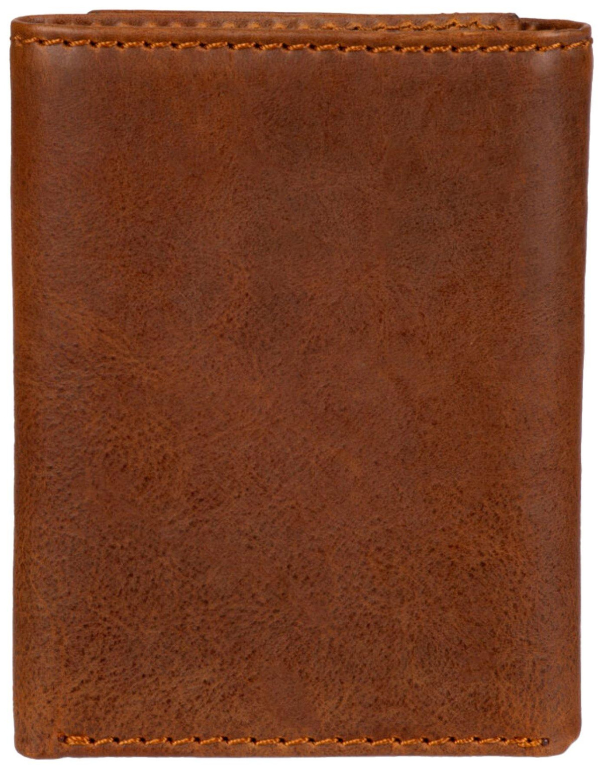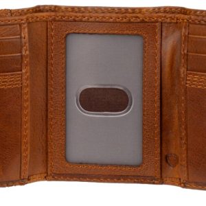 This Mens Trifold Wallet features a solid color design with heavy edge stitching on grainy leather, a trifold silhouette, a front embossed brand, an exterior slip pocket, slim profile, and RFID-blocking technology to help protect personal information from identity theft. Contains one ID window, 6 interior credit card slots, 2 slip pockets, and a currency compartment. Dimensions: 4.25 inches x 4.5 inches.